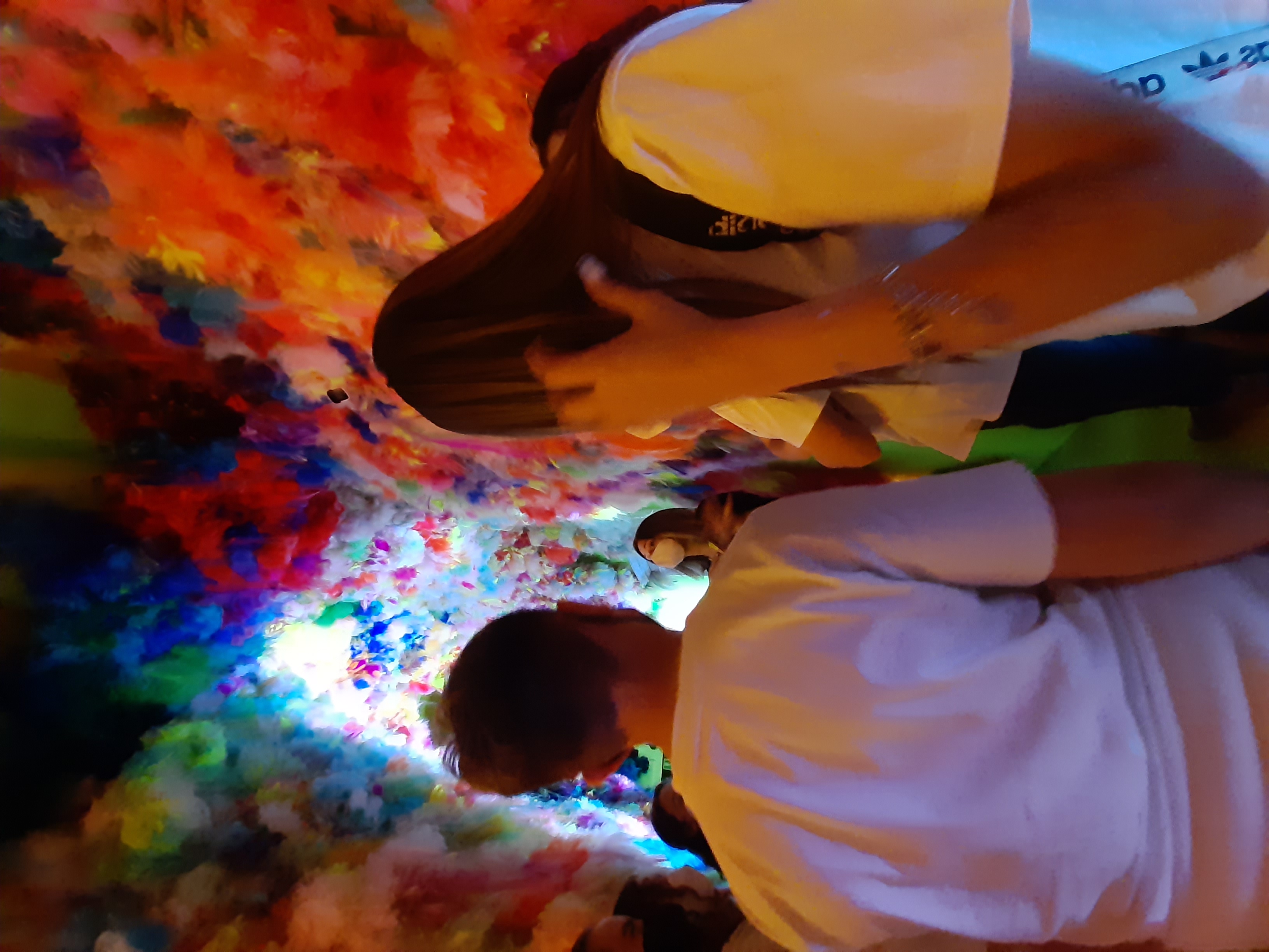 Dopo aver camminato sul vetro siamo entrati in una stanza, illuminata da una luce a led viola, sulla quale era appeso un enorme telo rosso e giallo, che a mio parere aveva una forma che richiamava una specie di farfalla. In merito a quest’opera non so bene cosa dirvi perché non mi aveva particolarmente affascinato ma anche questo era parecchio strano, perché allo stesso tempo mi sentivo rapito da quell’opera ma anche consapevole che non riuscivo a comprenderne il senso…Tutto quello che posso dirvi è che mi comunicava una sensazione di gioia e di smarrimento allo stesso tempo.