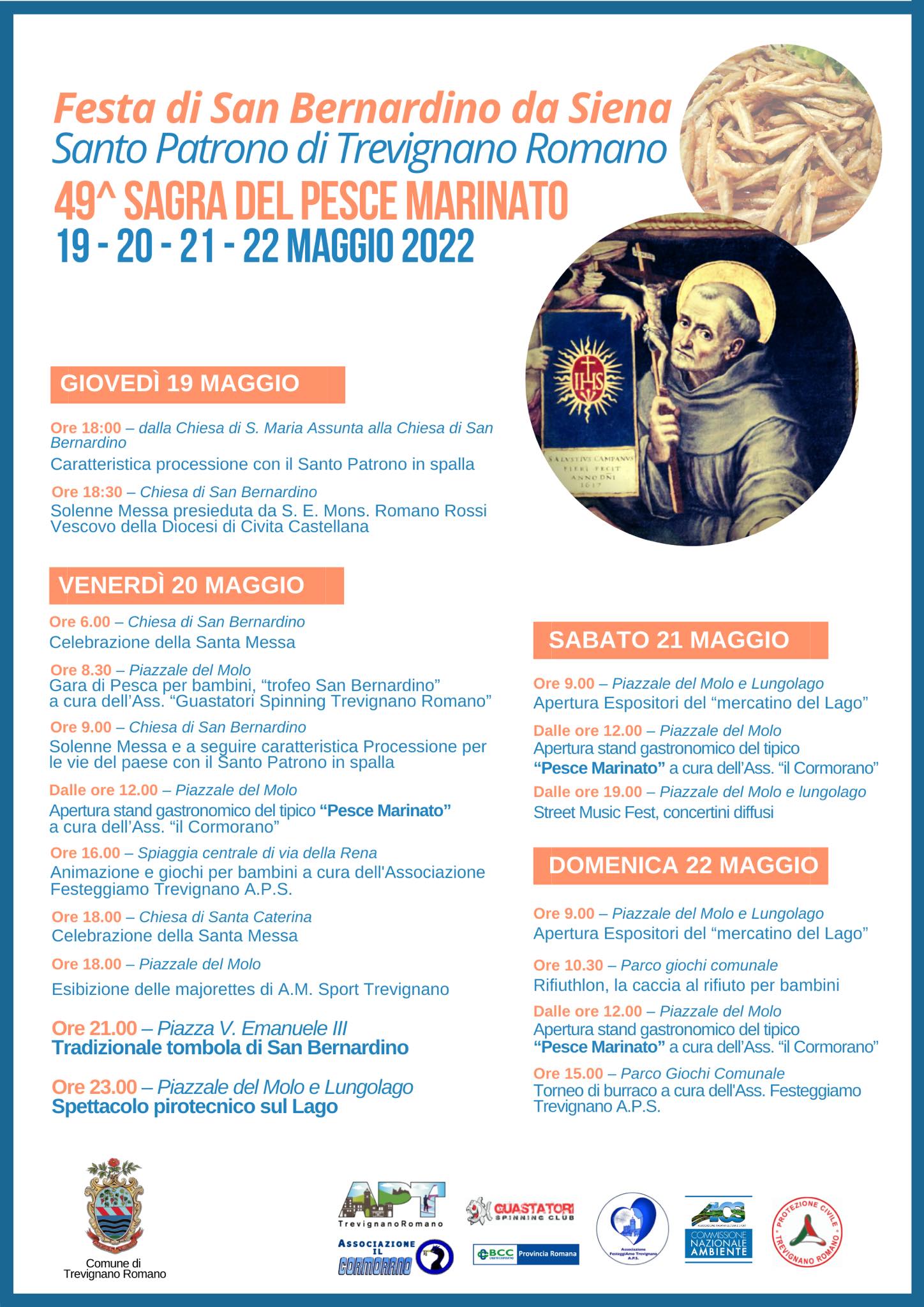 Riceviamo e pubblichiamo – La nostra Comunità si avvicina alle celebrazioni liturgiche e ai tradizionali festeggiamenti in onore del Santo Patrono di Trevignano Romano San Bernardino da Siena e alla “Sagra del Pesce Marinato” giunta alla sua 49esima edizione.