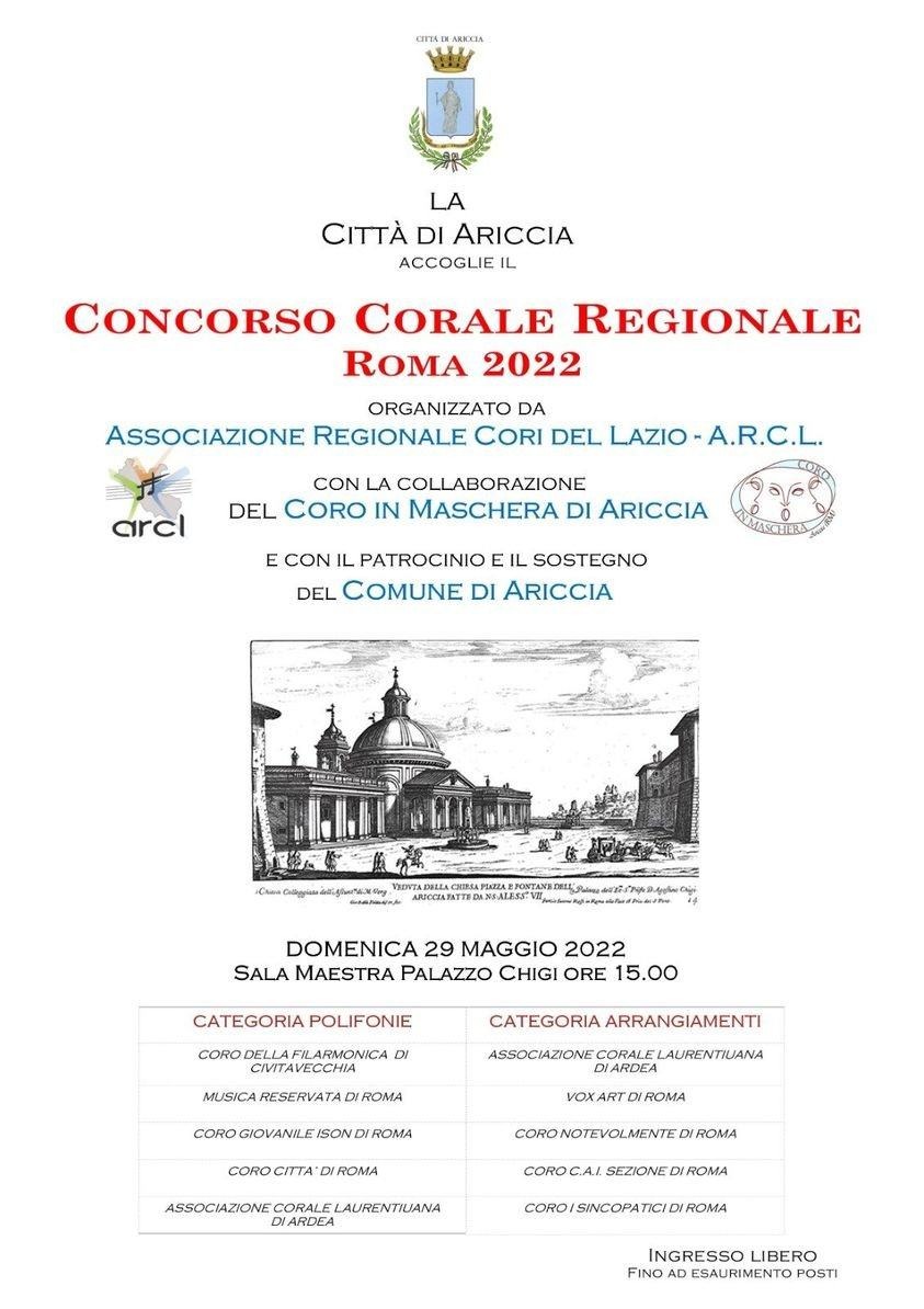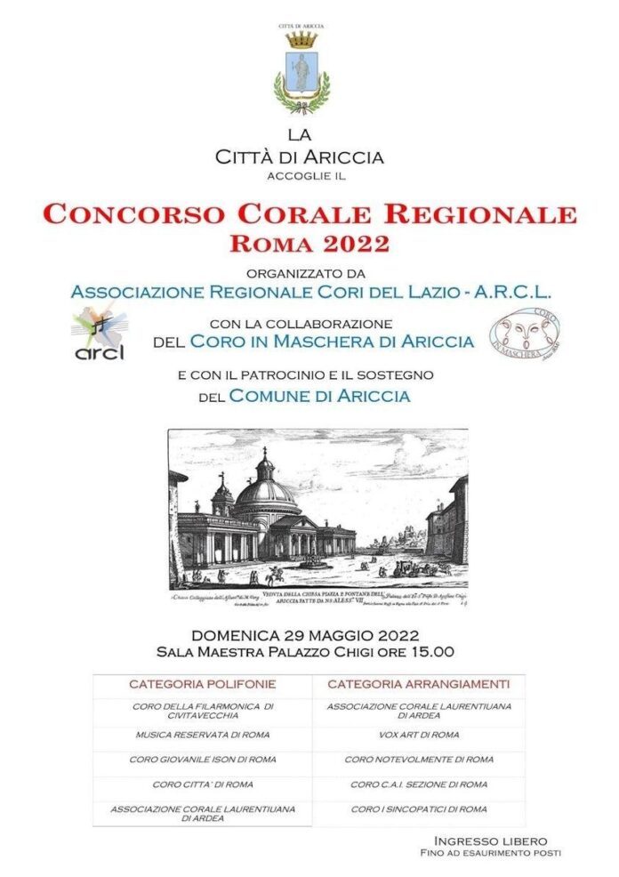 Domenica 29 maggio, nella Sala Maestra di Palazzo Chigi ad Ariccia, si terrà il Concorso Corale Regionale “Roma 2022”. Dopo lo stop dovuto alla pandemia torna il concorso organizzato dall’ Associazione Regionale Cori del Lazio, in collaborazione con il “Coro in Maschera di Ariccia” , sarà diviso in due categorie e vedrà la partecipazione di 9 cori per un totale di circa 250 coristi provenienti da tutta la regione che verranno giudicati da professionisti di alto livello tra cui Piero Monti direttore del coro Accademia Santa Cecilia.