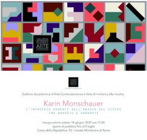 L’Accademia Internazionale di Significazione Poesia e Arte Contemporanea, in convenzione formativa con l’Università degli Studi di Roma Tre, accreditata dalla Regione Lazio, iscritta all’albo di Roma Capitale e del Comune di Canale Monterano, presidente fondatrice la prof.ssa Fulvia Minetti, vicepresidente il dott. Renato Rocchi, direttore artistico Antonino Bumbica, inaugura la mostra di Karin Monschauer alla Galleria Accademica d’Arte Contemporanea della Città d’Arte Canale Monterano di Roma in Corso della Repubblica n.50 il 18 giugno 2022 alle ore 19.00, aperta al pubblico fino al 2 luglio 2022 ore 10,30-12,30 con ingresso gratuito.
