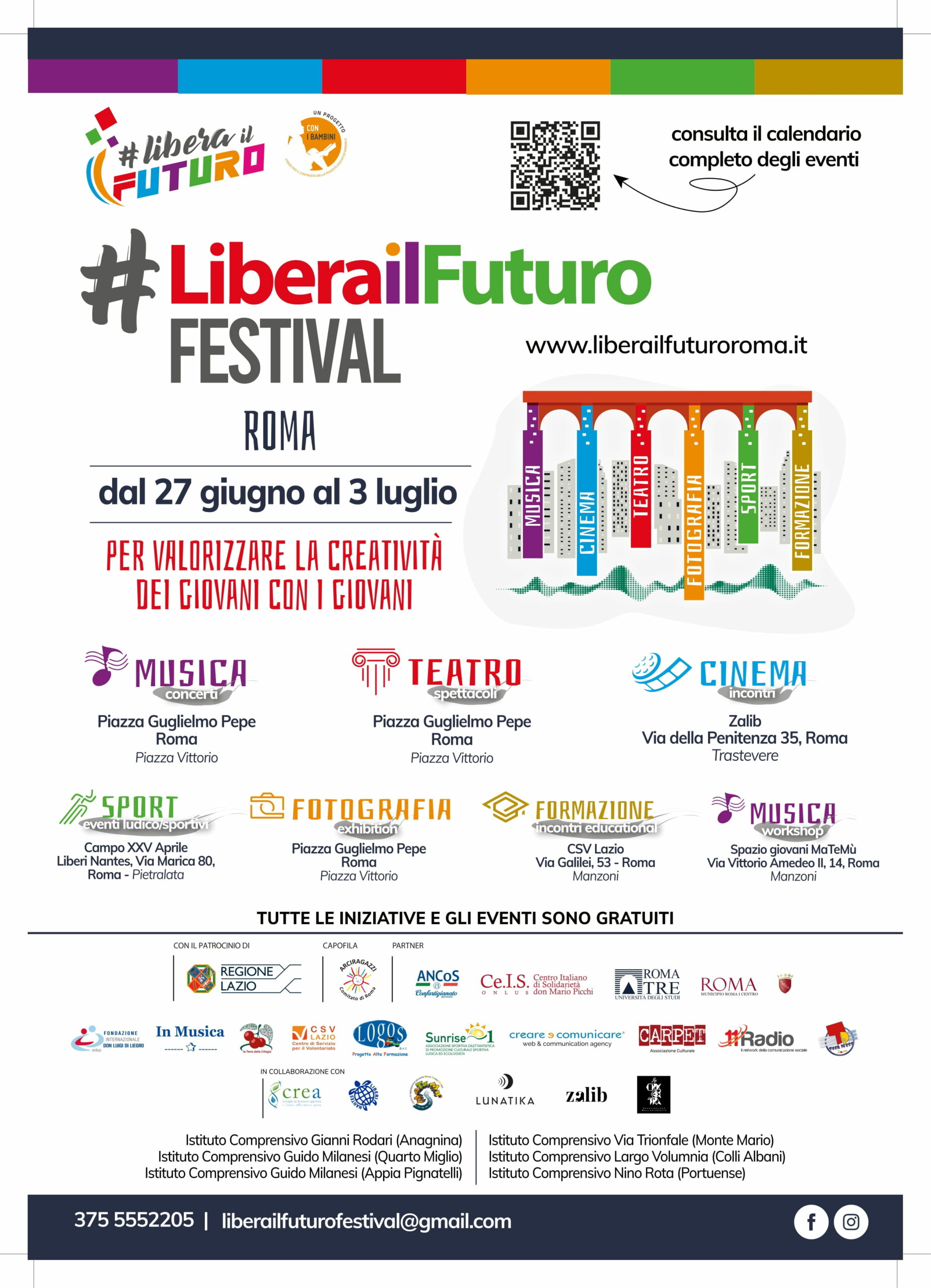 Il Festival rappresenta la tappa conclusiva dell’intera esperienza maturata sul territorio della città di Roma dal progetto #LiberailFuturo, il cui scopo negli ultimi quattro anni è stato quello di contrastare la povertà educativa tramite interventi pluridisciplinari nelle scuole, nei centri aggregazione giovanile con attività di monitoraggio, formazione e sport.
