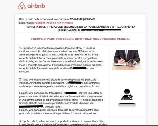 - Il rimpiattino: L’host ha creato un annuncio su un sito di seconda mano, o immobiliare, ma non appena chiederete informazioni vi dirà di spostarvi da un canale all’altro; ad esempio proponendovi tramite l’app ufficiale di continuare la conversazione per posta elettronica o messaggistica. Dopo alcune richieste di dettagli sul vostro arrivo, vi manderà un’altra email informandovi che per un problema con l’aggiornamento del calendario l’annuncio non è al momento visibile nella ricerca (in realtà lo ha rimosso), e vi fornisce per comodità il link diretto all’annuncio sul portale, ma si tratta di un sito clone.