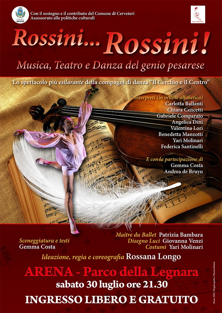 Il cartellone di eventi estivi si aprirà sabato 30 luglio con la danza. La compagnia “Il Cerchio e il Centro”, con le sue meravigliose coreografie porterà in scena “Rossini… Rossini”, un omaggio di musica, teatro e danza al genio indiscusso originario di Pesaro. Domenica 31 luglio, appuntamento con la Mandala Dance Company, prestigiosa realtà di danza del territorio.