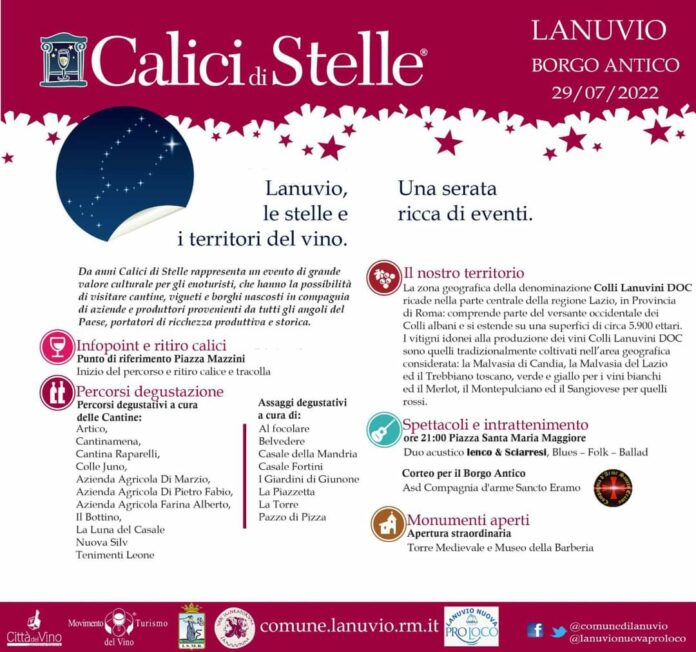 Vino, gastronomia locale e buona musica. Tutto è pronto a Lanuvio per Calici di Stelle, la manifestazione promossa dall’Associazione Città del Vino che si svolgerà stasera, venerdì 29 luglio, a partire dalle ore 19, all’interno del Borgo storico cittadino. L’iniziativa è organizzata dal Comune di Lanuvio in collaborazione con la Nuova Pro Loco.