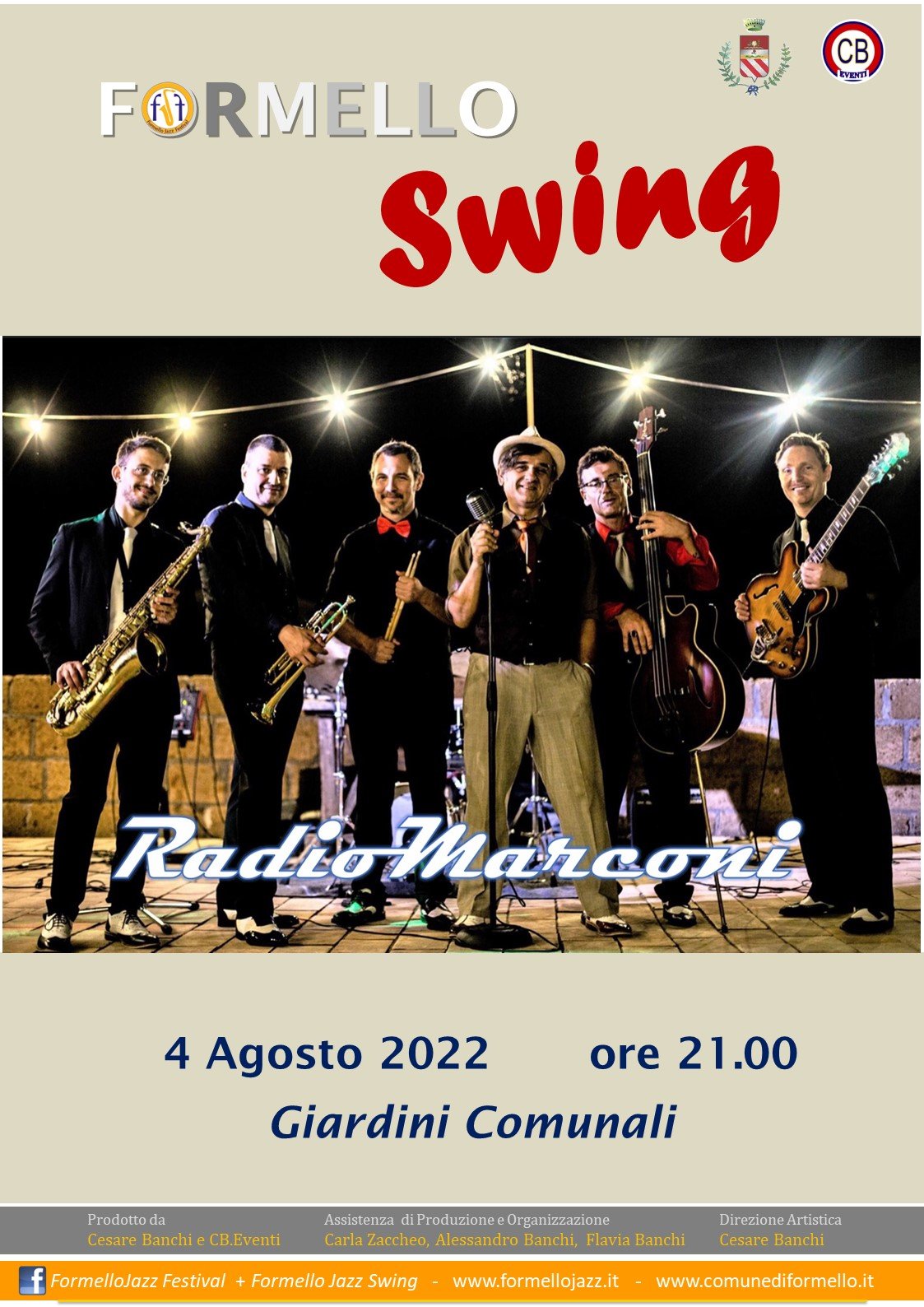 Domani 4 agosto, alle ore 21 nei giardini comunali Formello Jazz Festival di Cesare Banchi, con il Patrocinio del Comune di Formello, presenta all’interno della rassegna Formello Estate 2022 una serata swing con il gruppo “Radio Marconi”.