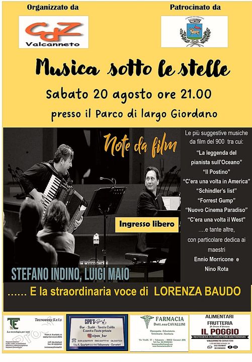 I maestri Stefano Indino e Luigi Maio, accompagnati dalla voce di Lorenza Baudo porteranno nella magia e le atmosfere di film come “Nuovo cinema Paradiso”, “La leggenda del pianista sull’oceano”, “C’era una volta in America”, “Il Postino”…