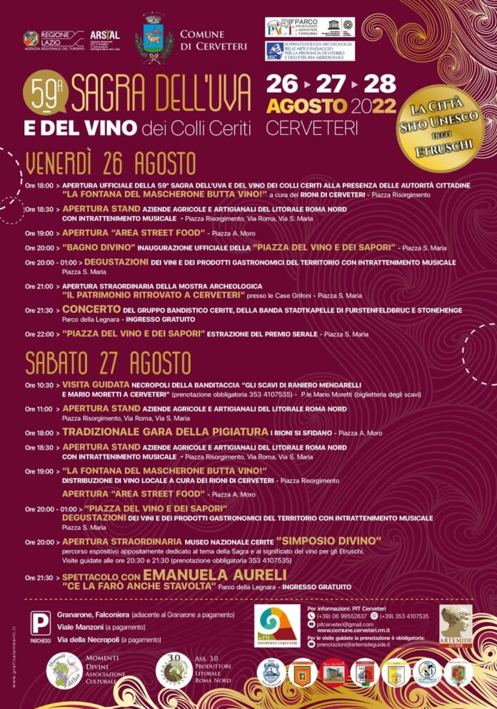Insieme ai Rioni di Cerveteri, all’Associazione Momenti Divini e all’Associazione 3.0, con un lavoro congiunto tra Assessorato alle Politiche Culturali e Politiche Agricole, ecco il programma dettagliato della 59° Sagra dell’Uva e del Vino dei Colli Ceriti, in programma da venerdì 26 a domenica 28 agosto nel Centro Storico di Cerveteri.