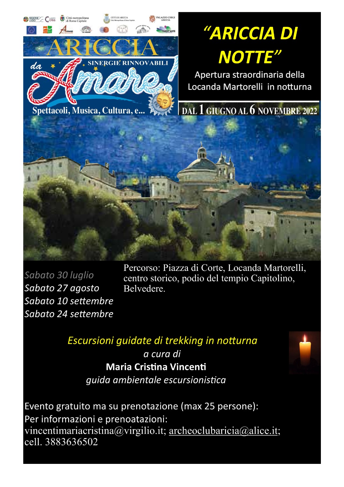 Sabato 27 agosto alle ore 21:30 si svolgerà il secondo dei quattro appuntamenti delle escursioni guidate di trekking in notturna “Ariccia di notte” a cura di Maria Cristina Vincenti guida ambientale escursionistica e archeologa-museologa. L’evento è inserito nel progetto del Comune di Ariccia “Ariccia da Amare – sinergie rinnovabili 2022”, finanziato con il contributo di LAZIOcrea, patrocinato dalla Città Metropolitana di Roma e dalla Regione Lazio.
