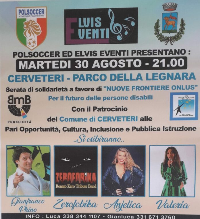 Una serata di spettacolo, musica, comicità e solidarietà. A proporla, nell’ambito del programma dell’Estate Caerite 2022 messo a punto dall’Assessorato alle Politiche Culturali, la PolSoccer – Appartenenti alla Polizia di Stato e la Elvis Eventi: l’appuntamento è per martedì 30 agosto alle ore 21:00 all’interno del Parco della Legnara.