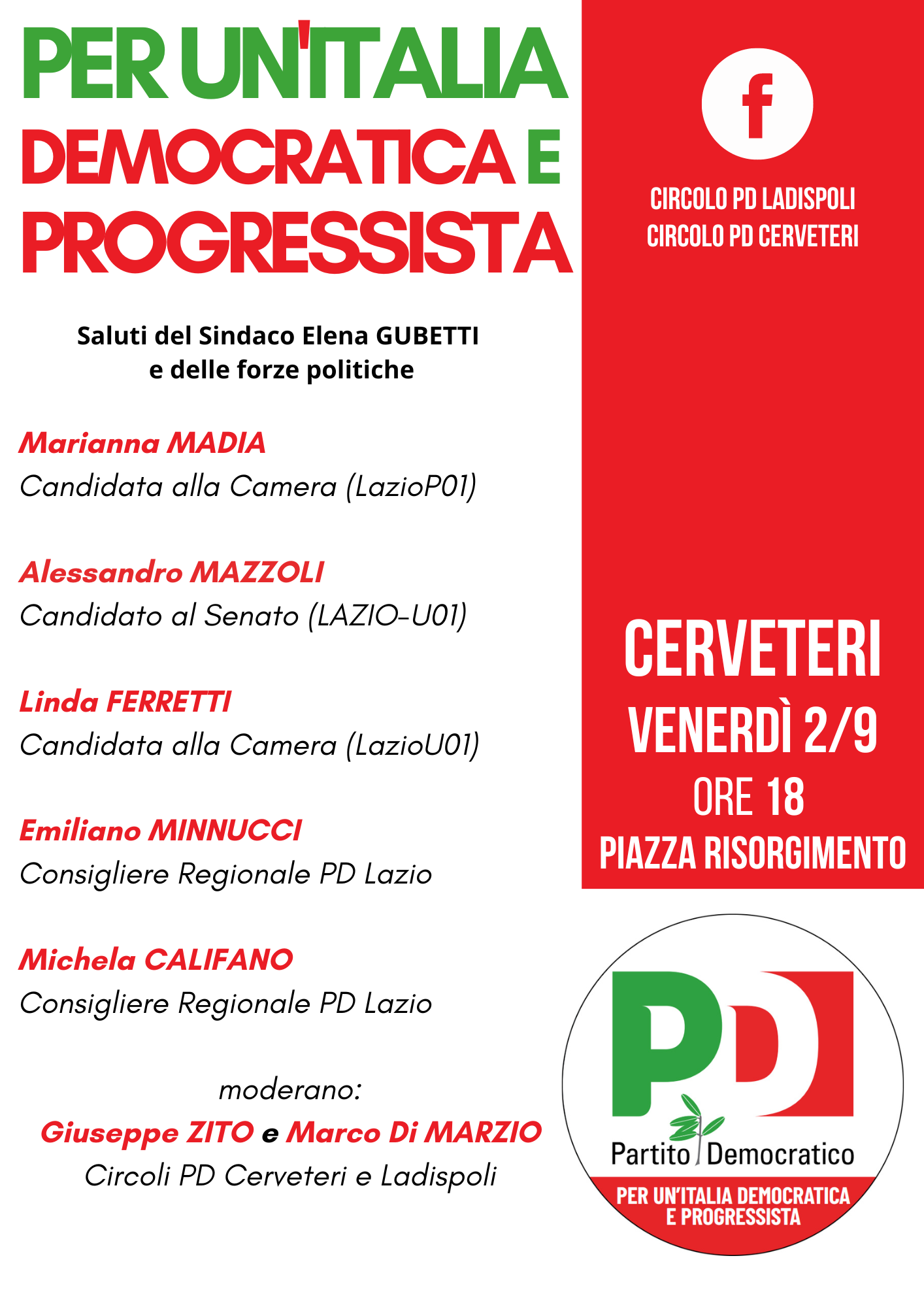 Presenti infatti, ci saranno Linda Ferretti, Vicepresidente del Consiglio comunale di Cerveteri e candidata alla Camera dei Deputati nel Collegio Lazio U01, l’On. Marianna Madia, già Ministro e candidata alla Camera dei Deputati Lazio P01 e Alessandro Mazzoli, già deputato e presidente della Provincia di Viterbo, candidato al Senato nel Collegio U01.