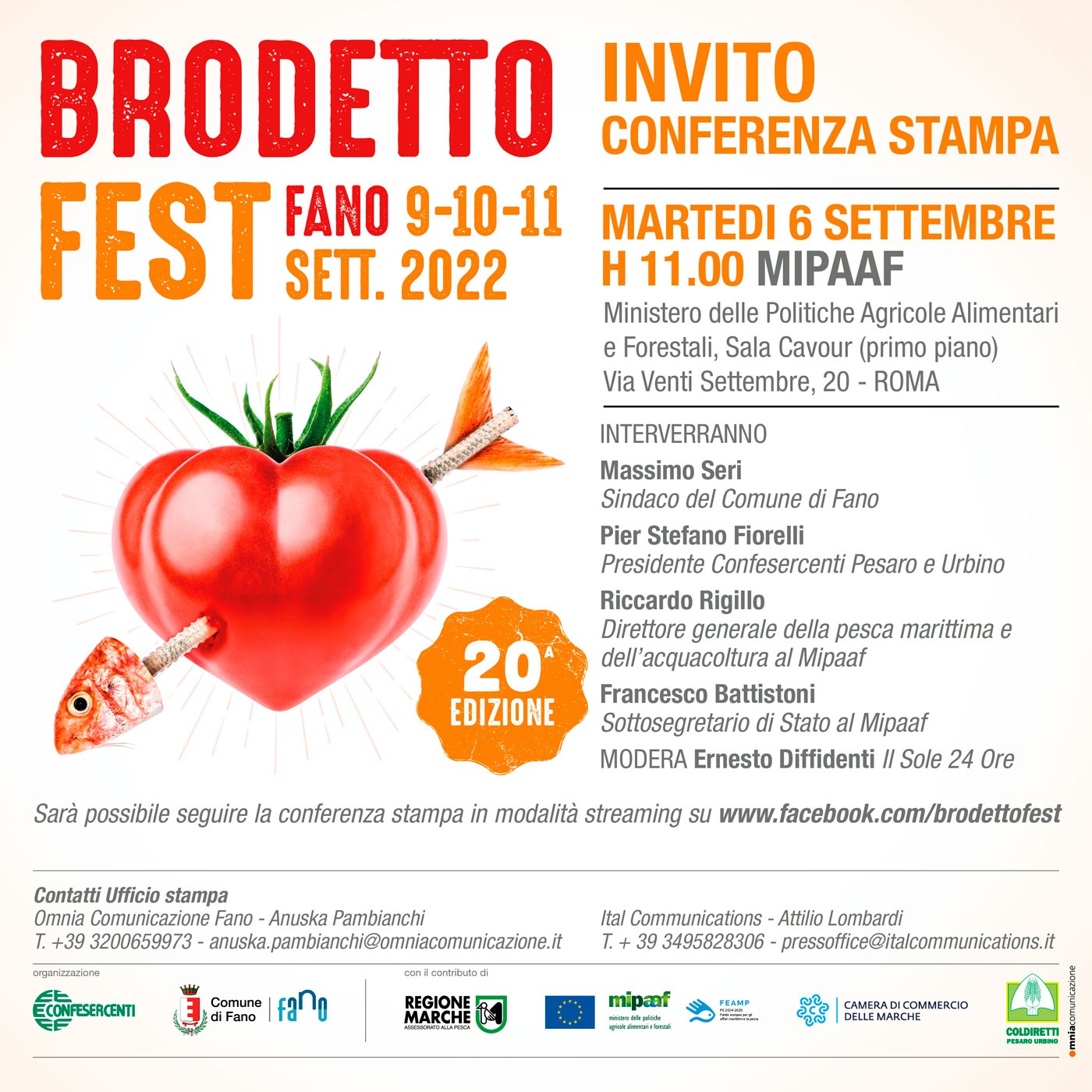 MartedΓ¬ 6 settembre alle 11 a Roma, nel Ministero delle Politiche Agricole Alimentari e Forestali, si svolgerΓ la conferenza stampa di presentazione delΒ BrodettoFest 2022,Β uno degli appuntamenti gastronomici piΓΉ importanti e noti del panorama italiano e internazionale. In occasione della 20Β° edizione, in programma ilΒ 9, 10 e 11 settembreΒ a Fano, verrΓ reso omaggio ad alcuni protagonisti che hanno contribuito a fare del format un punto di riferimento del nostro Paese, ben oltre i confini del food.Β Prenderanno parte alla conferenza stampa:Β Francesco Battistoni,Β Sottosegretario di Stato al Ministero delle Politiche Agricole, Alimentari e Forestali;Β Massimo Seri, Sindaco del Comune di Fano;Β Pier Stefano Fiorelli, Presidente Confesercenti Pesaro e Urbino;Β Riccardo Rigillo, Direttore generale della pesca marittima e dell’acquacoltura al Mipaaf.