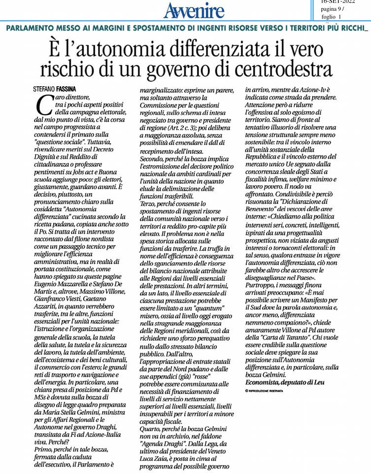 Se la risposta è no, come mi auguro e come dovremmo aver imparato dalla gestione della pandemia, sarebbe necessaria una presa di posizione sulla bozza di legge quadro presentata da Maria Stella Gelmini, ministra per gli Affari regionali del Governo Draghi. Tale bozza marginalizza il ruolo del Parlamento e regionalizza alcune funzioni che devono invece restare in ambito nazionale.