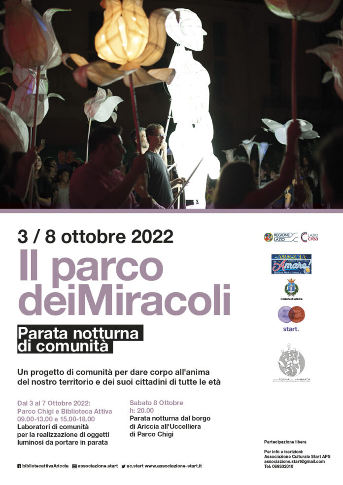 “Il parco dei miracoli” si struttura come laboratorio permanente che mira a coinvolgere la comunità del territorio nella realizzazione di grandi strutture luminose in fil di ferro e carta che verranno poi portate in parata notturna da tutti i partecipanti Sabato 8 alle h: 20.00 a partire dal borgo di Ariccia per arrivare nell’Uccelliera di Parco Chigi.