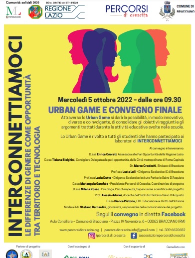 Dopo una serie di iniziative destinate sia agli insegnanti che agli studenti che da Marzo hanno coinvolto il territorio di Bracciano e le sue scuole secondarie di primo e secondo grado con l’obiettivo di “decostruire” gli stereotipi di genere attraverso l’ascolto e la valorizzazione delle risorse e delle differenze, il progetto, realizzato dall’Associazione Culturale Percorsi di crescita si conclude il 5 ottobre, con un urban game e un convegno..