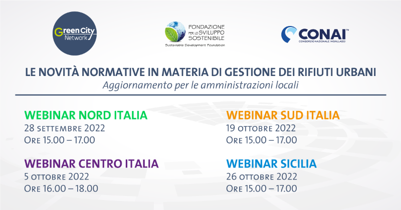 prosegue anche nel 2022 la collaborazione tra il Green City Network e CONAI finalizzata, quest’anno, ad aggiornare le città italiane sulle novità normative in materia di gestione dei rifiuti urbani e sulle dinamiche relative alla gestione dei rifiuti urbani e degli imballaggi delle rispettive aree regionali e di comparazione con le altre aree regionali attraverso l’organizzazione di 4 Webinar tra settembre e ottobre, ciascuno dedicato ad un’area geografica (Nord, Centro, Sud e Sicilia).