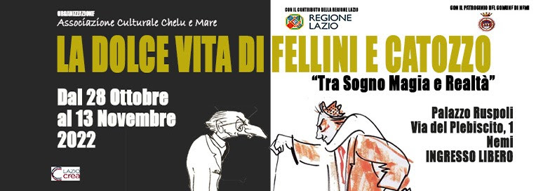 Dal prossimo 28 ottobre e sino al 13 novembre, lo storico Palazzo Ruspoli di Nemi riaprirà le porte ad una nuova esposizione, il cui titolo La Dolce Vita di Federico Fellini e Leo Catozzo: tra sogno, magia e realtà evidenzia il sodalizio di due grandi protagonisti del cinema italiano del dopoguerra.