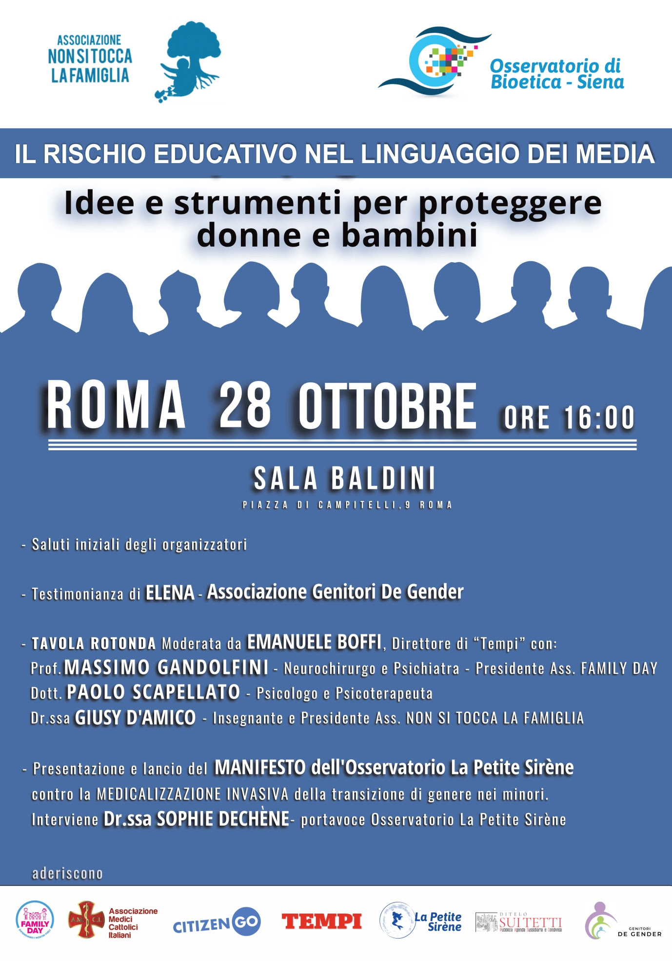 Il programma del convegno, che sarà ospitato nella Sala Baldini (piazza di Campitelli 9) a partire dalle ore 16, sarà aperto dalla testimonianza di Elena, una mamma romana che insieme ad altri genitori ha fondato l’associazione Genitori De Gender dopo aver affrontato e fortunatamente risolto la crisi di identità sessuale di sua figlia. Seguirà una tavola rotonda che sarà moderata dal giornalista Emanuele Boffi, direttore della rivista Tempi, e che vedrà la partecipazione di alcuni esperti: Massimo Gandolfini, neurochirurgo, psichiatra e presidente dell’associazione Family Day; Paolo Scapellato, psicologo e psicoterapeuta; e Giusy D’Amico, insegnante e presidente dell’associazione Non si tocca la Famiglia. Il convegno si concluderà con l’intervento di Sophie Dechène, portavoce dell’Osservatorio internazionale La Petite Sirène, che presenterà il Manifesto contro la medicalizzazione invasiva della transizione di genere nei minori. Questo Manifesto, nato in Francia e già pubblicato in altri Paesi europei, intende denunciare la propaganda sul cambiamento di sesso nei minori, in voga sui mass media e nei corsi di educazione sessuale a scuola. Il documento è già stato sottoscritto in Italia da numerosi medici, psicologi, docenti e esperti.