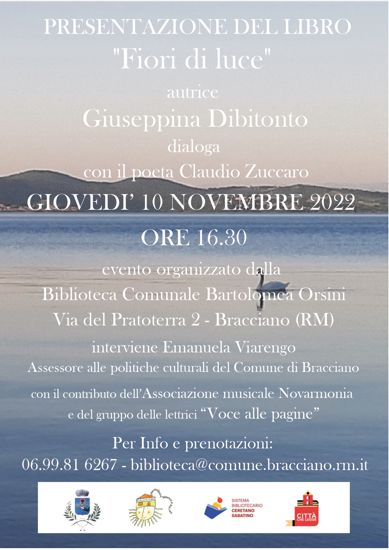 Giovedì 10 novembre alle 16 e 30 nella biblioteca comunale di Bracciano si terrà la presentazione del libro di poesie “Fiori di luce” dell’autrice Giuseppina Dibitonto.