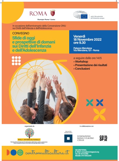 In occasione dell’anniversario della Convenzione ONU sui Diritti dell’Infanzia e dell’Adolescenza, del 1989, si svolgerà a Roma oggi, a Palazzo Merulana, il convegno “Sfide di oggi e prospettive di domani sui Diritti dell’Infanzia e dell’Adolescenza”, organizzato dai Poli Interculturali del Municipio Roma I, con l’alto patrocinio del Parlamento europeo.