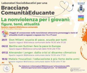 Il Comune di Bracciano sta intraprendendo un percorso che vuole valorizzare gli interventi di educazione non-formale per i bambini e le bambine, i ragazzi e le ragazze che vivono a Bracciano. lo spiega così l’assessore alle Politiche Sociali, Inclusione e Accoglienza Massimo Guitarrini. “Bracciano può diventare una Comunità educante se recupera il senso di solidarietà e mette in dialogo le famiglie, i servizi, le agenzie educative e l’associazionismo. Un anno fa vincemmo le elezioni con l’obiettivo di ricostruire il tessuto sociale del territorio partendo anche dai più piccoli e dai giovani. Così abbiamo deciso come amministrazione di organizzare, grazie a un finanziamento del governo precedente legato al Dipartimento per la Famiglia, dei Laboratori Socio-Educativi divisi per fasce di età.” Nel dettaglio “Abbiamo scelto per i più piccoli (5-11anni), in collaborazione con l’associazione Ti con Zero, di dislocare gli incontri non solo al centro del paese, ma anche a Bracciano Nuova e a Vigna di Valle, questo grazie alla gentile disponibilità di Don Fernando e Don Michelangelo delle Parrocchie del S.S. Salvatore e Santa Maria Madre della Chiesa. Per i bambini e le bambine tra gli 11 e i 13 anni ci siamo avvalsi del contributo dell’associazione Percorsi di Crescita per fare un lavoro sulla consapevolezza delle proprie emozioni e contrastare il fenomeno del bullismo e cyber-bullismo Per i più grandi (14-17 anni) invece avviamo un percorso sulla Nonviolenza avvalendoci del contributo dell’associazione Biblioteca per la Nonviolenza di Daniele Taurino Formatore accreditato presso il Consiglio Nazionale Giovani e delegato presso lo European Youth Forum per il quale coordina il network “Youth, Peace and Security”.” Si tratta nel complesso di “percorsi costruiti per bambini e bambine, ragazzi e ragazze tra i 5 e 17 anni per contrastare le conseguenze della pandemia sui più giovani e accompagnare la loro crescita civica e sociale. Bracciano deve iniziare a diventare una comunità educante capace di accogliere e valorizzare le diversità di ognuno.” L’accesso ai laboratori è completamente gratuito, occorre semplicemente prenotare la partecipazione: Sapiens: In Viaggio tra Espressività, Narrazioni e Manualità (5-11 anni) Per Adesioni e Informazioni Ass. Ti con Zero 349/8728813 fernanda.pessolano@gmail.com; L’arte delle Emozioni: no al Bullismo (11-13 anni) Per Adesioni e Informazioni percorsi di crescita: percorsidicrescita.info@gmail.com – tel 339 6620682; La nonviolenza per i giovani: figure, temi, attualità (14-17 anni) Per Adesioni e Informazioni Biblioteca per la Nonviolenza APS: biblitoecaperlanonviolenza@gmail.com – tel 066520591