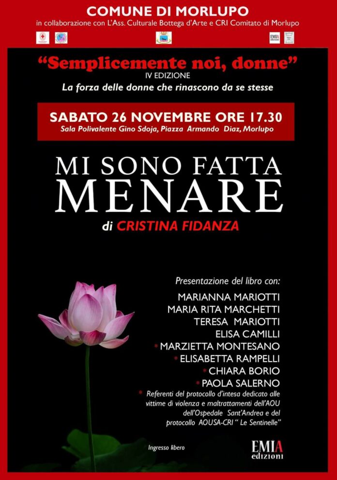 A Morlupo (Rm), in occasione della “Giornata Internazionale per l’eliminazione della violenza contro le donne”, sabato 26 novembre, alle ore 17.30, presso la Sala Polivalente “Gino Sdoja”, in Piazza Armando Diaz, patrocinata dal Comune, e organizzata dall’associazione Bottega d’Arte, in collaborazione con la CRI locale, si svolgerà un evento in cui si parlerà di femminicidio prendendo spunto da un libro autobiografico, scritto da Cristina Fidanza ed edito da EMIA Edizioni, dall’inequivocabile titolo: “Mi sono fatta menare”.