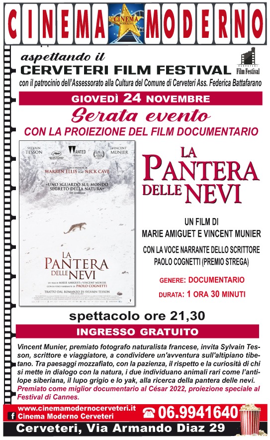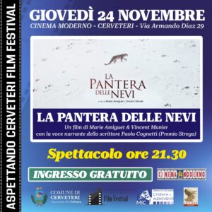 A Cerveteri torna il Cerveteri Film Festival. Prima dell’avvio ufficiale della rassegna, domani giovedì 24 novembre alle ore 21:30 presso il Cinema Moderno proietteremo una prestigiosa anteprima: “La Pantera delle Nevi”.