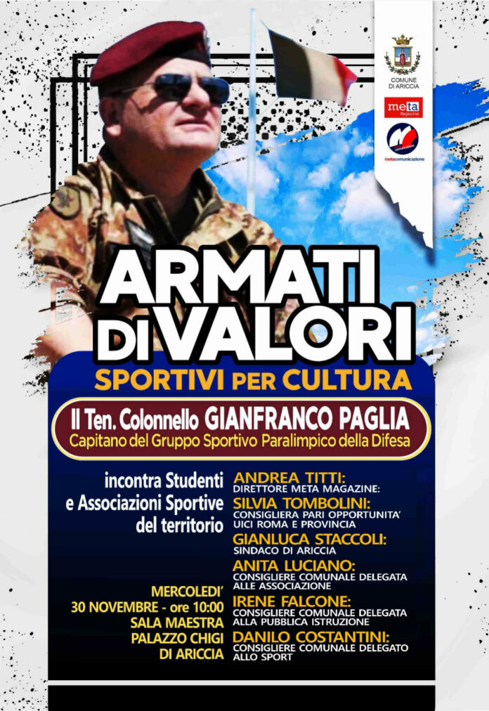 Mercoledì 30 Novembre, a partire dalle ore 10:00, presso la Sala Maestra di Palazzo Chigi in Ariccia: Meta Comunicazione e la testata giornalistica Meta Magazine, con il patrocinio del Comune di Ariccia: avranno il piacere di ospitarlo, in occasione di un evento dal titolo: “Armati di Valori – Sportivi per Cultura”, nel quale il Ten. Col. Gianfranco Paglia incontrerà una delegazione di studenti, società sportive ed associazioni del territorio, per parlare di accessibilità, sport e cultura dell’inclusione.
