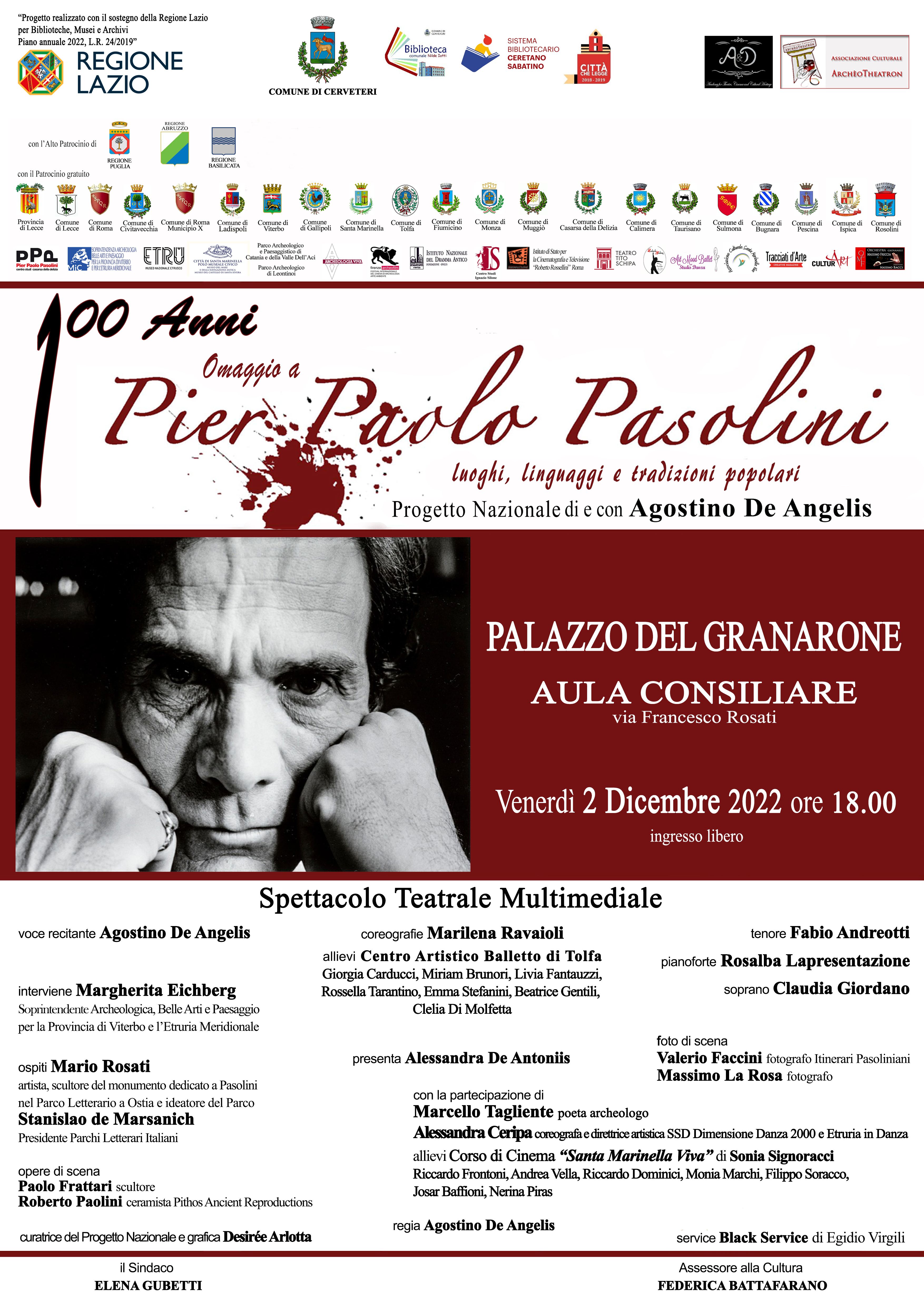 A 100 anni dalla nascita del genio indiscusso del cinema e della letteratura italiana, Pier Paolo Pasolini, il Comune di Cerveteri, attraverso l’Assessorato alle Politiche Culturali e la Biblioteca Comunale “Nilde Iotti”, lo ricorda con un evento culturale e teatrale di assoluto pregio.