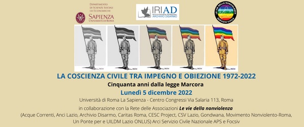 Si terrà a Roma il prossimo 5 dicembre, dalle ore 10 alle ore 18, al Centro Congressi dell’Università di Roma La Sapienza (Via Salaria 113) il convegno “LA COSCIENZA CIVILE TRA IMPEGNO E OBIEZIONE 1972-2022. CINQUANTA ANNI DALLA LEGGE MARCORA” organizzato dall’Istituto di ricerche internazionali Archivio Disarmo in collaborazione con il Dipartimento di Scienze Sociale ed Economiche – DiSSE della Sapienza, la Rete delle Associazioni Le vie della nonviolenza (Acque Correnti, Anci Lazio, Archivio Disarmo, Caritas Roma, CESC Project, CSV Lazio, Gondwana, Movimento Nonviolento-Roma, Un Ponte per e UILDM Lazio ONLUS) Arci Servizio Civile Nazionale APS e Focsiv.