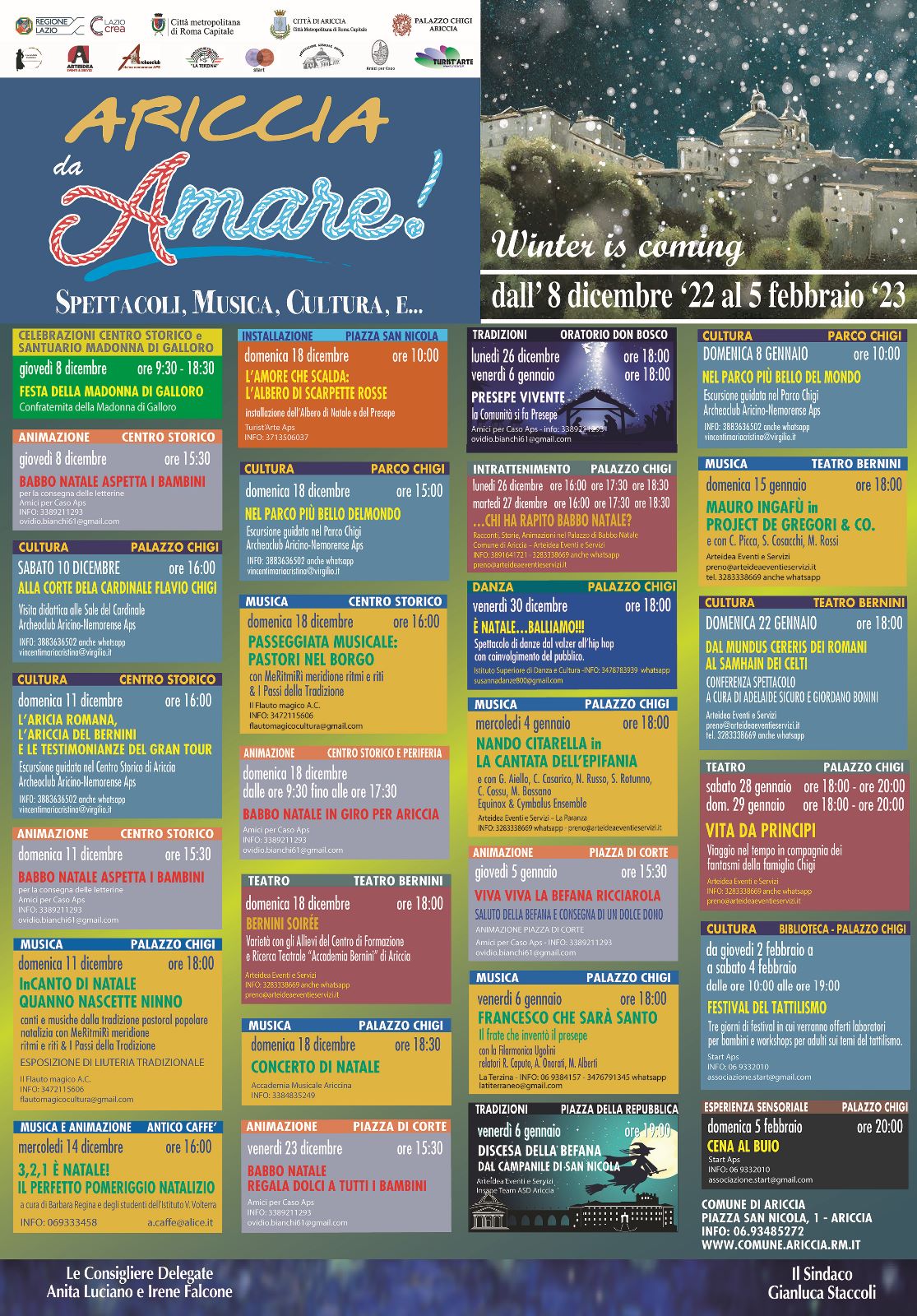 “Esprimo grande soddisfazione – ha commentato il Sindaco di Ariccia Gianluca Staccoli – per il calendario degli eventi di “Ariccia da Amare – Winter is coming” che prende il via domani con uno degli appuntamenti, la festa della Madonna di Galloro, che segnano l’inizio del magico periodo natalizio. Ringrazio tutti coloro che hanno contribuito all’organizzazione di questo cartellone di eventi e a quanti, nel corso dei prossimi mesi, realizzeranno i singoli appuntamenti. Un ringraziamento particolare va alle consigliere delegate Anita Luciano e Irene Falcone, che hanno speso tempo ed energie per portare a casa un programma ricco e che riuscirà, ne sono certo, ad accontentare tutti”.