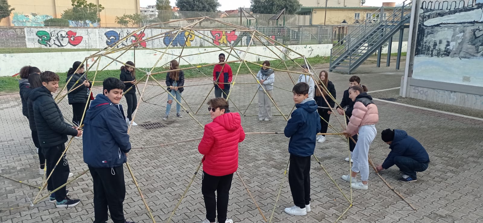 L’ultima sfida è stata progettare una cupola geodetica di dimensioni tali da contenere tutti i 21 studenti coinvolti nel modulo, quindi con un’altezza di almeno 2,5 metri ed una superficie interna di circa 27 metri quadrati. La cupola è stata realizzata utilizzando canne raccolte a Torre Flavia, opportunamente tagliate e montate seguendo il progetto che avevano precedentemente realizzato, utilizzando un software di progettazione.