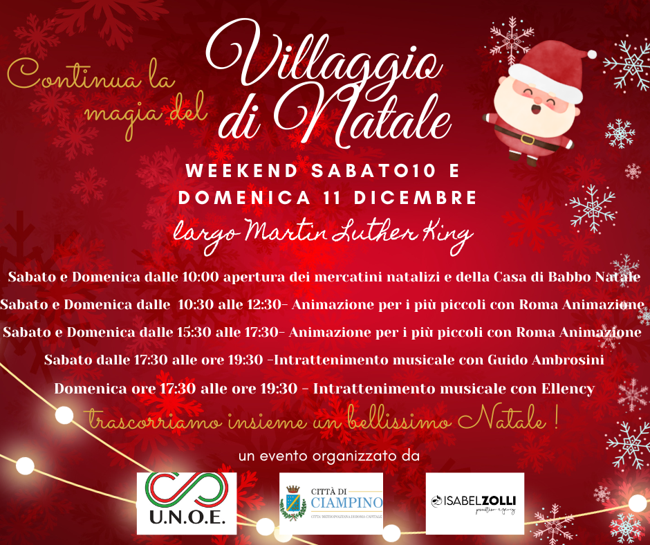 Dopo la splendida inaugurazione del Villaggio Natalizio ed il grande successo dell’iniziativa per le scuole “I bambini incontrano Babbo Natale” prosegue la magia del Natale a Ciampino. Questo weekend a Largo Martin Luther King continua l’intrattenimento per i più piccoli, curato dal gruppo Roma, immancabile la “casa di Babbo Natale”, dove ricevere un ricordo di Babbo Natale.