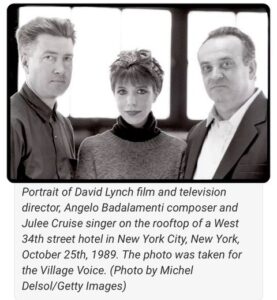 Il compositore sin da giovanissimo suona il piano, in seguito i suoi studi universitari lo portano a diventare un insegnante di musica in una scuola di Brooklyn. Dal fare l’insegnante di musica ai ragazzi adolescenti viene ingaggiato come coach per aiutare Isabella Rossellini a interpretare un brano in Blue Velvet (Velluto blu nella fedele traduzione italiana), comporrà la musica di un brano ex novo dopo essere subentrate questioni di diritti per l’esecuzione della Cover. Comincia così, nel 1986, una delle più importanti collaborazioni di Badalamenti, quella con il maestro cineasta David Lynch il quale scrive le parole del suddetto brano (Blue Star per Blue Velvet) in connubio con le note composte da Badalamenti – interpretata da I. Rossellini – e dell’avvolgente Mysteries Of Love interpretata da Julee Cruise. La collaborazione tra il compositore e il Regista continua nel 1990 con Wild at Heart (Cuore selvaggio) e con I segreti di Twin Peaks; nel 1992 prosegue con Fuoco cammina con me, nel 1997 con Lost Highway (Strade perdute), nel 1999 con The Straight Story (Una storia vera), nel 2001 con il lungometraggio postmoderno Mulholland Drive (in cui partecipa anche come attore nel personaggio di Luigi Castigliane) che vede come protagoniste Naomi Whatts e Laura Harring e divenuto film cult, nel 2002 con Rabbits (Sitcom citata, tra l’altro, in un altro lavoro postmoderno di Lynch che restituisce allo spettatore – ancora una volta – una sensazione di immersione tra onirico e reale, a tratti allucinatoria, che è Inland empire, del 2006). L’ultima loro collaborazione è per Twin Peaks – Il ritorno e nel 2015 Badalamenti si esibisce a Los Angeles nel grande concerto The Music of David Lynch. Proprio quest’ultimo, il visionario cineasta, scrive il suo saluto all’amico definendolo il ‘fratello’ Angelo nel suo messaggio sull’home page del sito “Welcome to Twin Peaks” dove si legge: “Oggi… niente musica. Oh, Angelo… riposa in pace”.