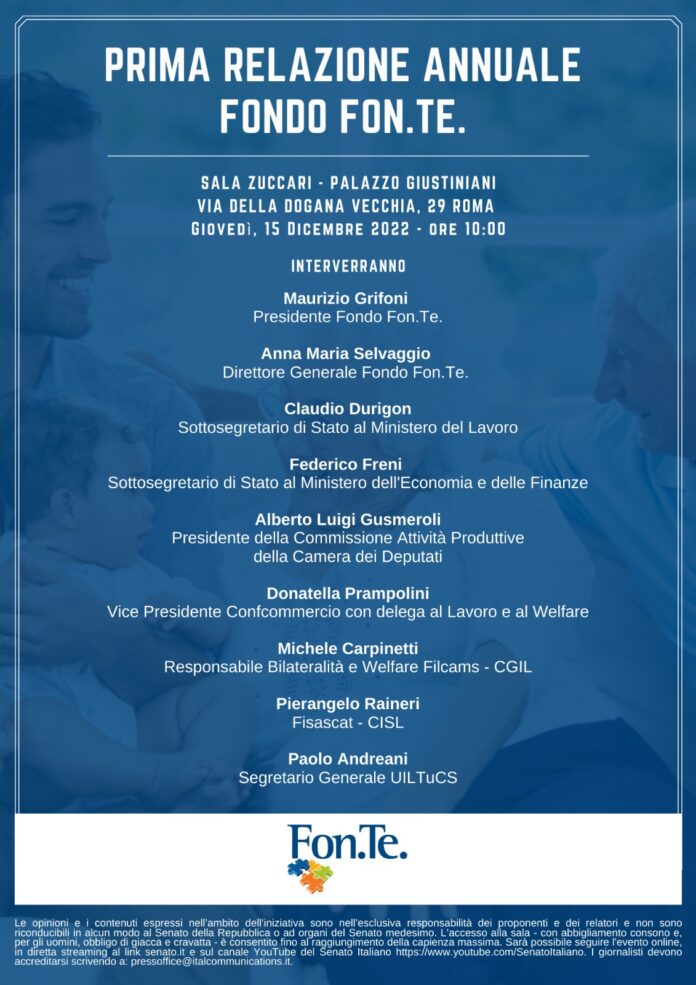 Giovedì 15 dicembre, dalle 10, nella Sala Zuccari del Senato, a Roma, si terrà la Prima Relazione Annuale del Fondo Fon.Te., il Fondo pensione complementare per i dipendenti da aziende del Terziario, con 255 mila iscritti, oltre 39 mila aziende associate e 5 miliardi di patrimonio in gestione.