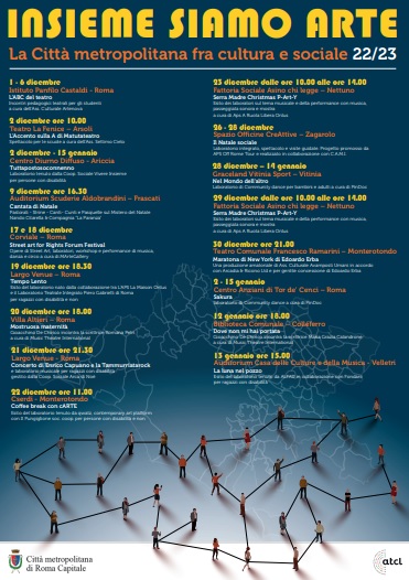 Ha preso l’avvio a inizio dicembre il progetto Insieme siamo arte. La Città metropolitana fra cultura e sociale con una serie di attività tra laboratori, spettacoli, concerti, presentazioni di libri, cortometraggi nato dalla collaborazione tra Città metropolitana di Roma Capitale e ATCL Circuito Multidisciplinare del Lazio, sostenuto da MIC – Ministero della cultura e Regione Lazio. Una proposta multidisciplinare che si estenderà, in questa sua prima edizione fino al 15 gennaio anche in realtà che richiedono interventi di lunga durata per sedimentare lo spettacolo quale strumento di coesione sociale. È in certi casi l’inizio, in altri il proseguimento di un lavoro di realtà ben radicate nei territori in cui operano con soggetti svantaggiati o con disabilità, il cui esito non è immediatamente riscontrabile nella capacità di riempire una sala, quanto nella tipologia di intervento, nel rendere le arti sceniche elemento di relazione tra le persone, qualunque sia la loro condizione, per una ritrovata identità territoriale e di coesione dei sistemi sociali. Il progetto vuole cominciare a realizzare un modello integrato di offerta culturale, al di fuori dei contesti tradizionali di fruizione, per far comprendere quanto le arti dello spettacolo siano compenetrate nel vissuto quotidiano. È questa la funzione del teatro sociale di comunità e degli interventi che tendono a ricostruire l’identità di un territorio e della sua collettività.
