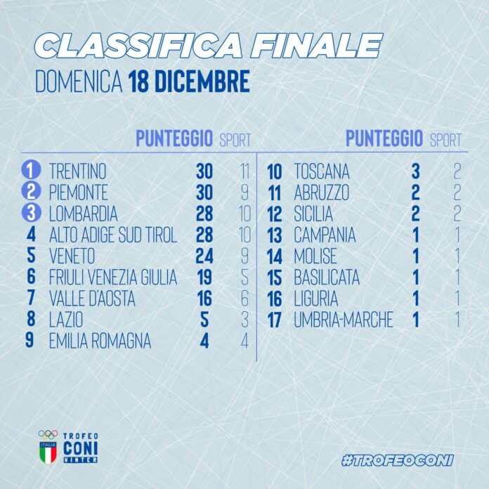 Si è conclusa a Piznolo, in provincia di Trento, la prima edizione del Trofeo CONI Winter, che ha visto protgonisti le giovani e giovani atleti delle discpline invernali e del ghiaccio. La rappresentativa del Lazio ha chiuso la rassegna all’ottavo posto (5 punti), prima regione del centro e del sud Italia in quanto nelle prime sette posizioni si sono classificate tutte regioni del nord.
