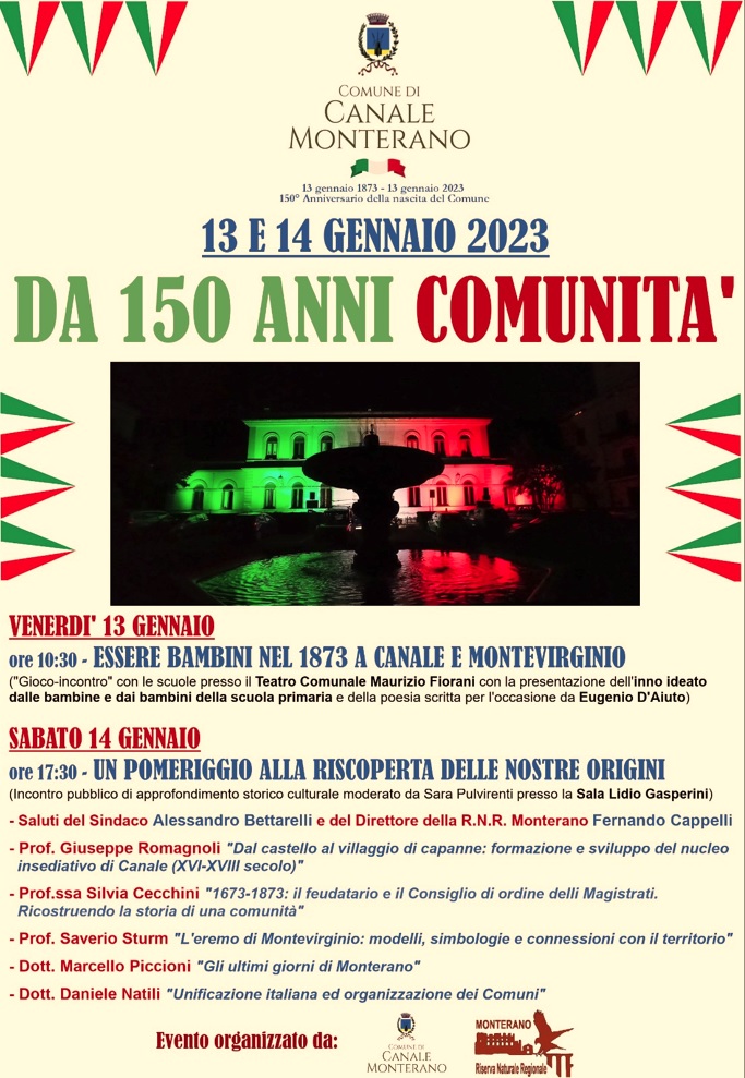Un incontro con le scuole e una conferenza sulla storia di Canale Monterano, queste le iniziative che l’Amministrazione Comunale presenta ai cittadini per il 150esimo del Comune. Venerdì prossimo ricorre infatti il secolo e mezzo della nuova denominazione “Canale Monterano”, avvenuta con Regio Decreto del 13 Gennaio 1873.
