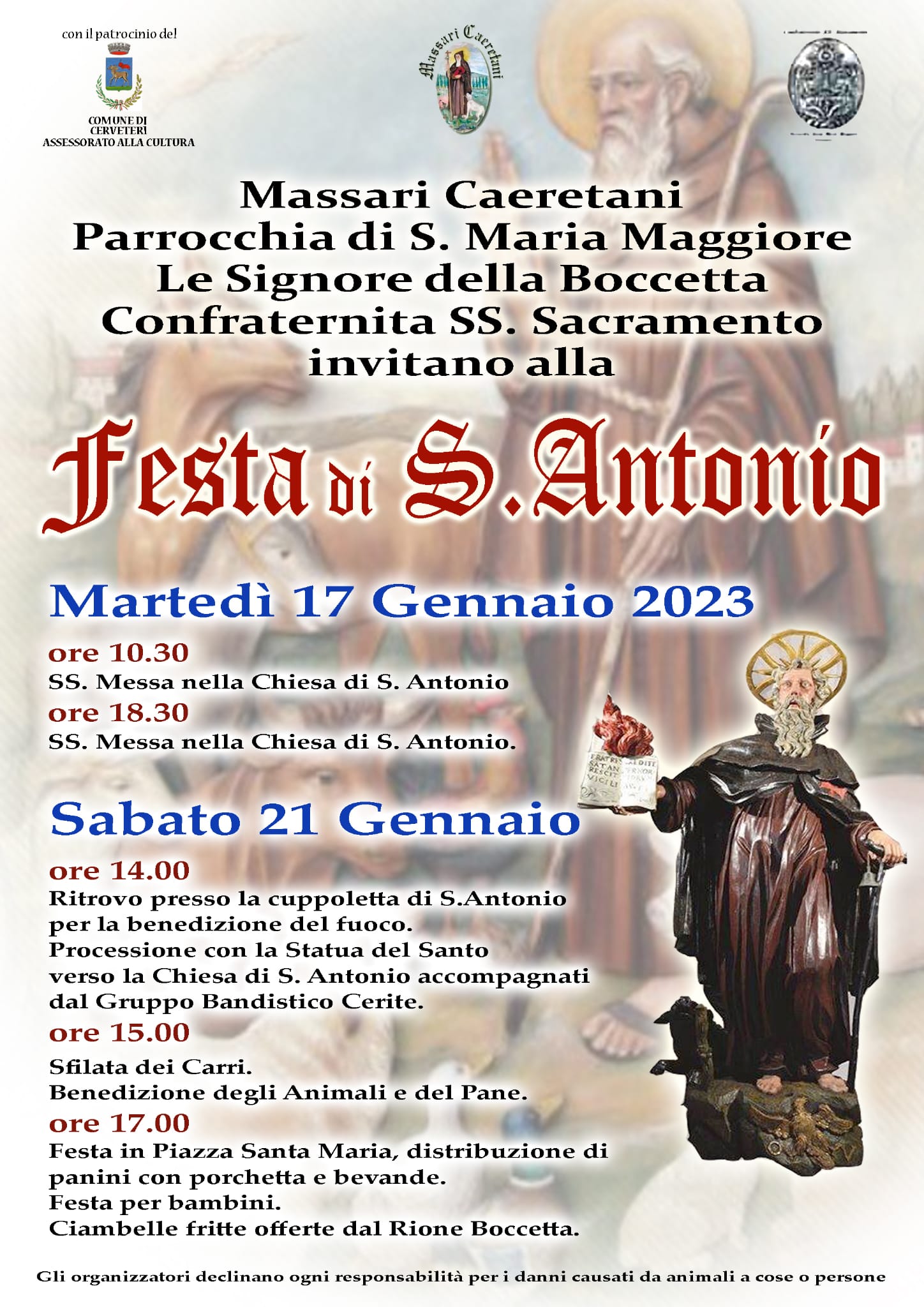 Alle 15 la *benedizione degli animali e del pane* e la *tradizionale sfilata dei carri* Alle *ore 17:00* avrà luogo la *festa in Piazza Santa Maria*, distribuzione di panini con porchetta e bevande, festa per bambini e ciambelle fritte offerte dal Rione Boccetta.