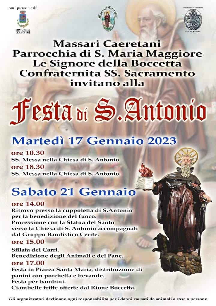 Alle ore 14:00 ritrovo presso la Cuppoletta di Sant’Antonio per la benedizione del fuoco. Seguirà processione con la Statua del Santo verso la Chiesa di Sant’Antonio accompagnati dal Gruppo Bandistico Cerite. Alle ore 15:00, sfilata dei carri e benedizione degli Animali e del Pane. Alle ore 17:00 grande festa in Piazza Santa Maria, distribuzione di panini con la porchetta e bevande, animazione per bambini e ciambelle fritte offerte dal Rione Boccetta.