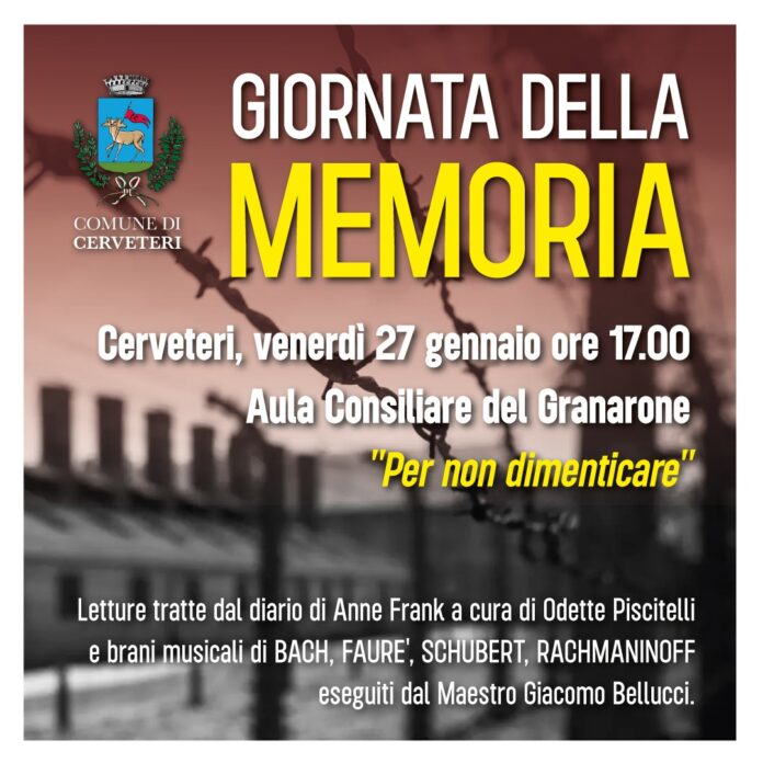 Venerdì 27 gennaio, a partire dalle ore 17:00, all’interno dell’Aula Consiliare del Granarone, l’Assessorato alle Politiche Culturali del Comune di Cerveteri promuove l’evento “Per non dimenticare – La Giornata della Memoria”.