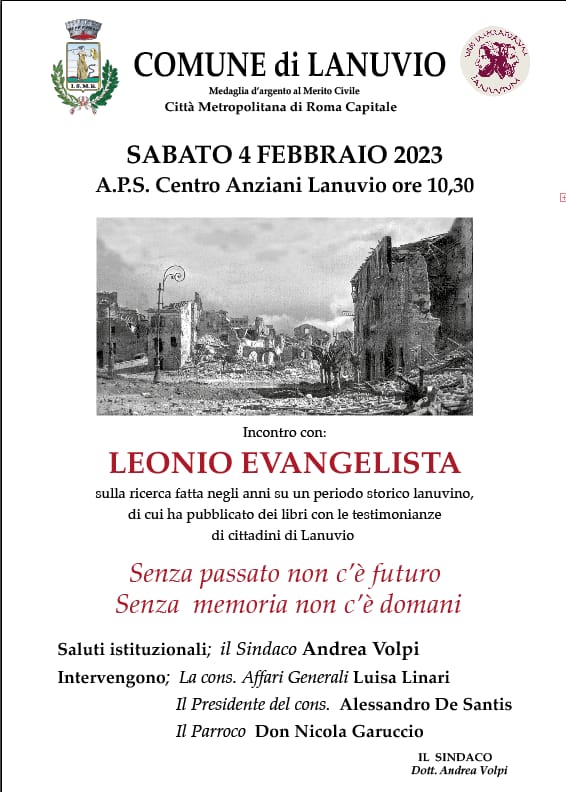 Sabato 4 febbraio alle ore 10,30 al centro anziani di Lanuvio di Piazza della Maddalena avrà luogo un incontro pubblico con Leonio Evangelista, ex Sindaco di Lanuvio, storico locale e preziosissimo testimone delle terribili devastazioni del periodo della Seconda Guerra Mondiale nel nostro paese. Evangelista interverrà a ricordare, in particolare alle nuove generazioni, l’importanza di proseguire e di non mandare disperso il suo lavoro di testimonianza e ricerca continua.