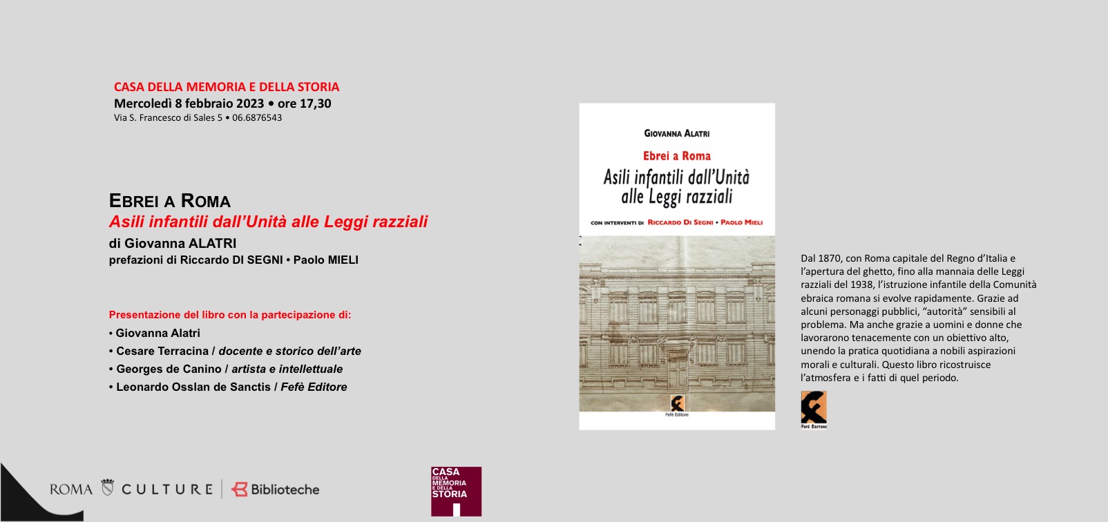 “Asili infantili dall’Unità alle leggi razziali” di Giovanna Alatri, con prefazione del Rabbino Capo della Comunità romana Riccardo Di Segni e dello storico e giornalista Paolo Mieli, sarà presentato a Roma alla Casa della Memoria e della Storia (Via S. Francesco di Sales 5) mercoledì 8 febbraio alle ore 17 e 30. Con l’autrice si confronteranno Cesare Terracina docente e storico dell’arte, Georges de Canino artista e intellettuale. Coordina Leonardo de Sanctis.