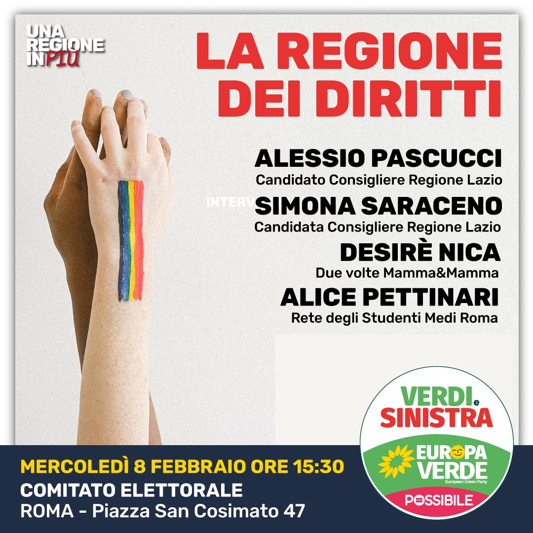 “Una società può definirsi davvero civile solamente se a ogni cittadina e cittadino verranno riconosciuti gli stessi diritti. Ho fatto della tutela dei diritti uno dei punti cardine della mia azione politica e amministrativa. L’ho fatto da Sindaco di Cerveteri per dieci anni e intendo farlo anche una volta eletto in Consiglio Regionale del Lazio. Di questo, ne parlerò oggi alle 15 presso il comitato elettorale di Piazza San Cosimato n.47 a Roma, insieme a Simona Saraceno, candidata e co-portavoce regionale di Europa Verde, nel convegno “La Regione dei Diritti”. Un pomeriggio di testimonianze, di storie, di esperienze umane e amministrative. Come sempre, il tema dei diritti sarà al centro dell’attenzione del mio impegno politico e del mio programma”.