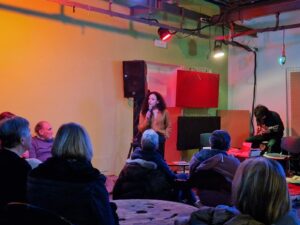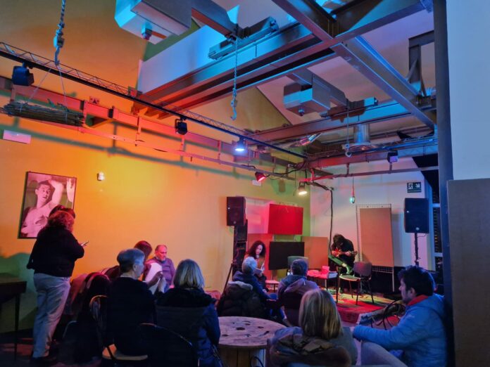 In sottofondo l’accompagnamento musicale di Valerio Artino ha reso l’atmosfera più unica che rara e lo si comprendeva dall’attenzione del pubblico in assoluto silenzio.