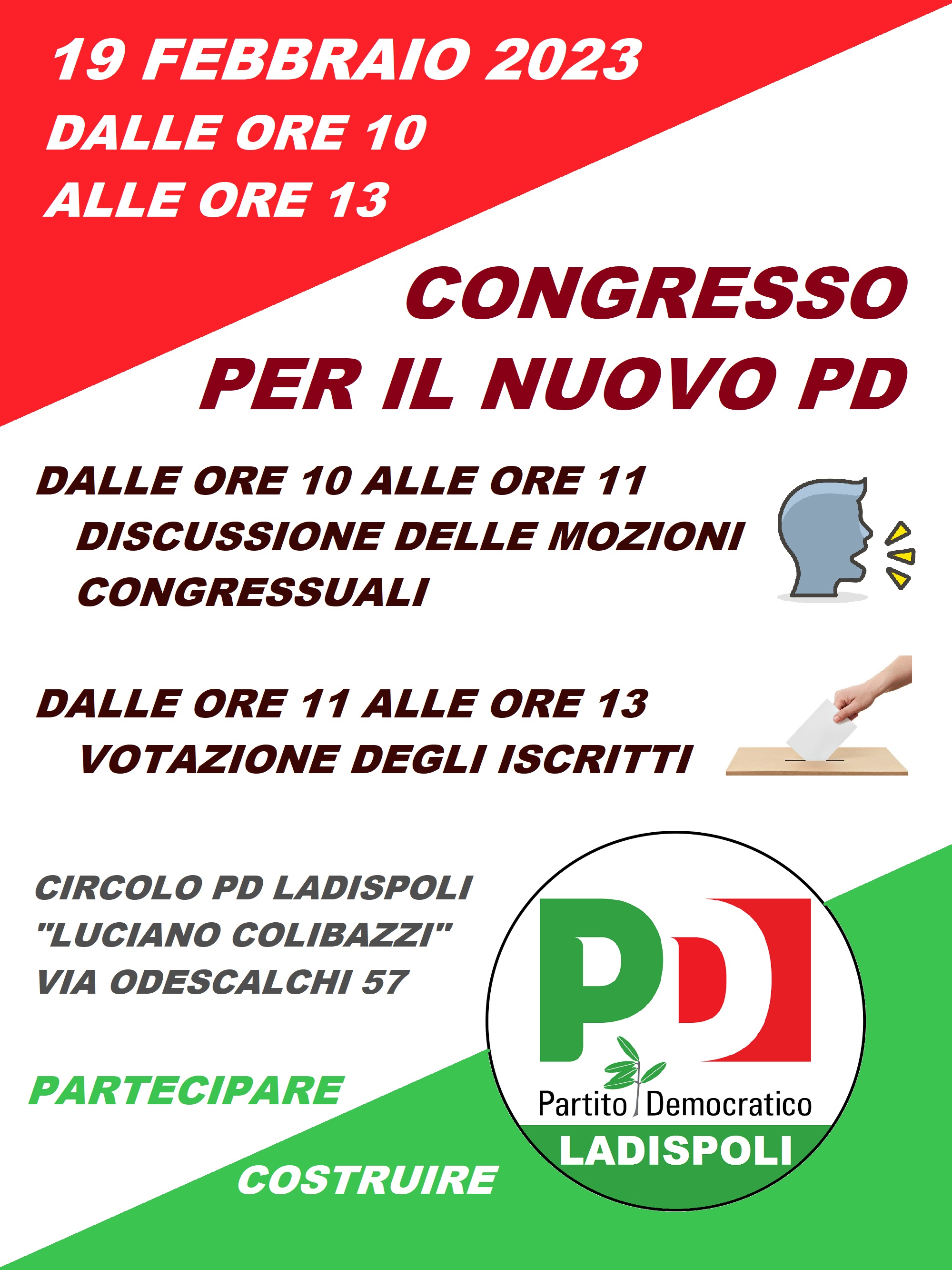 I due candidati alla segreteria più votati nei congressi di circolo, indetti in tutta Italia dal 3 al 12 febbraio, con Lazio e Lombardia entro il 19 febbraio, accederanno alle primarie aperte, indette domenica 26 febbraio dalle ore 8:00 alle ore 20:00, che a Ladispoli si svolgeranno sempre presso il Circolo PD.