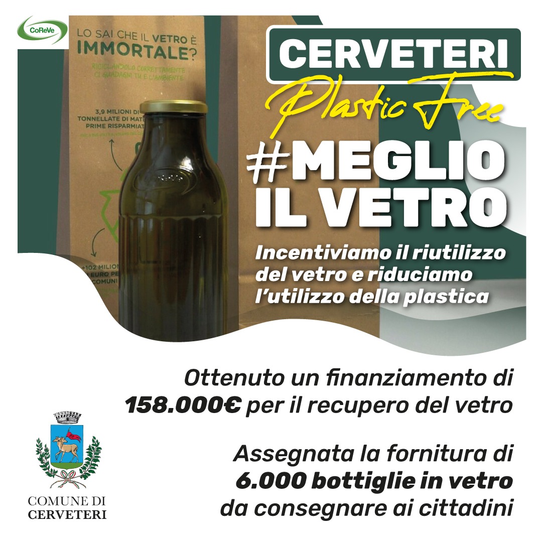 “Dopo l’importante finanziamento che ci siamo aggiudicati nel novembre scorso di 158mila euro mirato ad implementare il corretto recupero e conferimento dei rifiuti in vetro, con il bando CoReVe, possiamo dare vita ad una nuova campagna di sensibilizzazione sul tema della produzione dei rifiuti e sul riutilizzo di materiali riciclabili – ha dichiarato il Sindaco di Cerveteri Elena Gubetti – riceveremo ben 6mila bottiglie in vetro riciclato, che distribuiremo alla cittadinanza per sensibilizzarla al riciclo di un materiale come il vetro e allo stesso tempo per invitarla ad eliminare le classiche bottiglie in plastica”.
