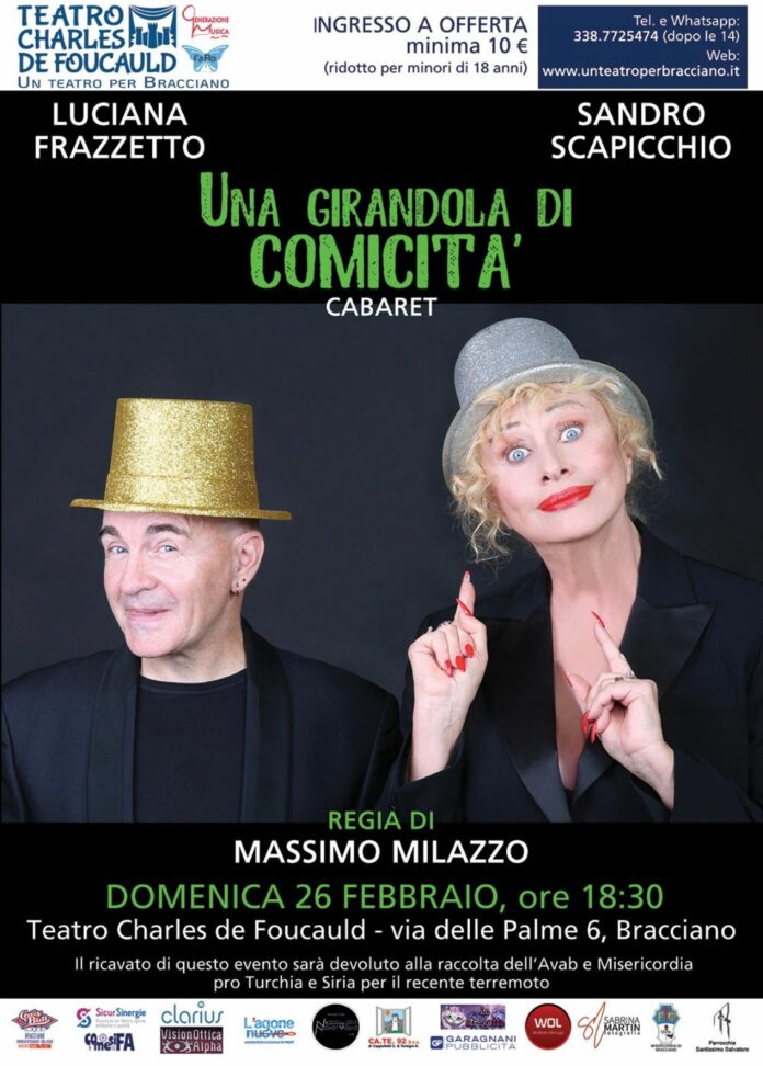 Domenica 26 febbraio alle ore 18.30 tornano a grande richiesta con un nuovo spettacolo due eclettici artisti Luciana Frazzetto e Sandro Scapicchio. Regaleranno al pubblico allegria e musica con il loro spettacolo di Varietà per far trascorrere una piacevole e coinvolgente serata all’insegna del buonumore e del divertimento.