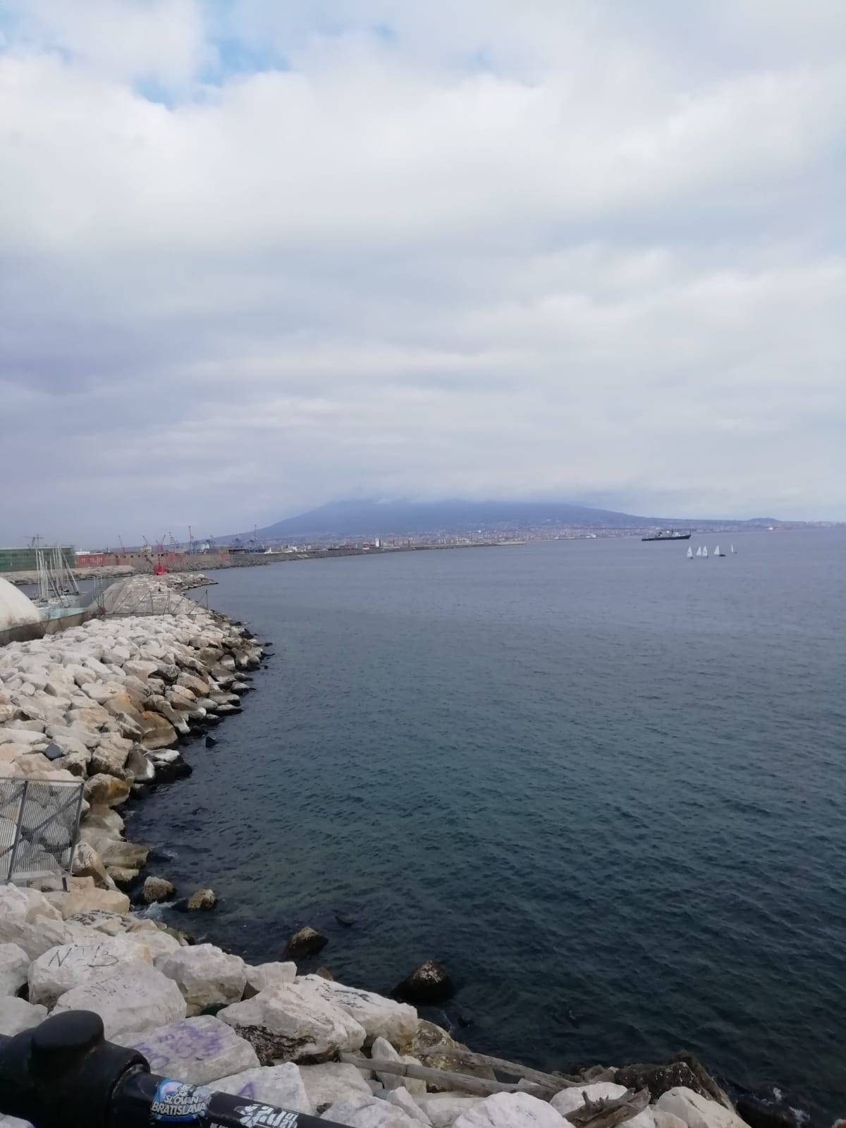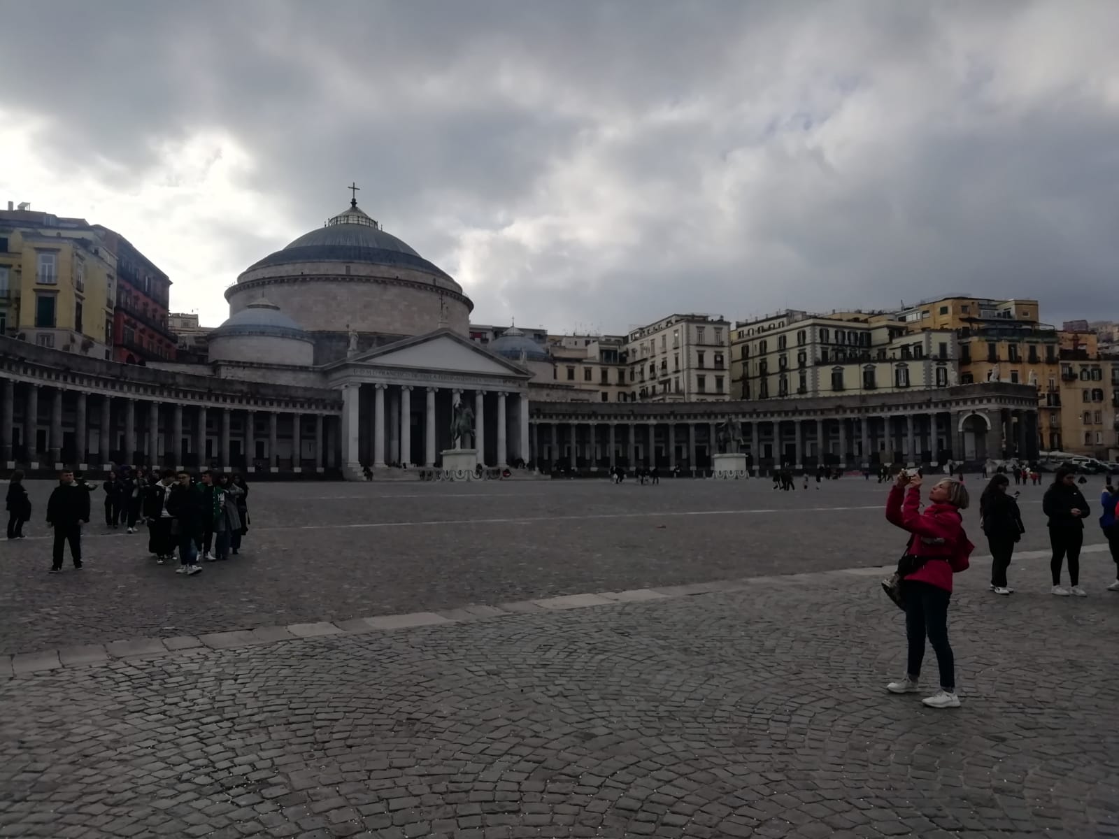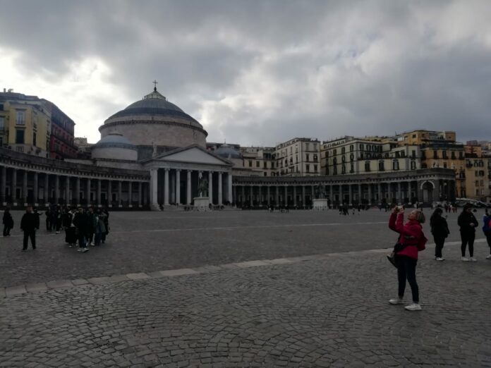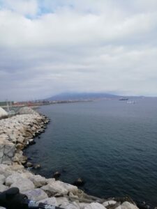 Le docenti hanno quindi condotto il piccolo gruppo al Complesso Monumentale di Santa Chiara che comprende la Chiesa gotica (Santa Chiara) il monastero ed il convento. Per ragioni di tempo la classe ha potuto visitare solo la splendida Chiesa gotica, dall’antico rosone traforato. Per lo stesso motivo e per ragioni dettate dalla prudenza non si è potuta visitare la Neapolis sotterrata.  Ogni tanto sono state concesse ai ragazzi piccole pause per farli rifocillare o semplicemente per   interrompere di qualche minuto il cammino.  Il colonnato di piazza Plebiscito, scendendo da piazza Dante, si è parato dinnanzi ai nostri geometri all’ improvviso ed in tutta la sua maestosità. Piazza del Plebiscito ha una forma particolare, per metà semicircolare e per metà rettangolare fino al Palazzo Reale: ciascuna delle due parti esalta e completa l’altra. Qui il gruppo si è fermato un po’. Si avvicinava l’ora del tramonto ed ognuno, in cuor suo, tirava le fila della giornata, rivivendola. La piazza è stata un ottimo punto di sosta per qualche spiegazione, per le riflessioni personali e per il divertimento. Non poteva mancare il lungomare e la vista del Vesuvio. A dire il vero la sommità del vulcano era nascosta dalle nuvole ma ciò ha conferito ancora più poesia all’ immagine e al paesaggio. Sullo sfondo tutta la bellezza del Maschio Angioino. Infine è cominciata la via del ritorno ed i ragazzi erano sempre gioiosi, eccitati, felici di scoprire Napoli ad una condizione: tutti insieme. La 1 B CAT colpisce perché è una classe particolarmente unita e nessuno si sognerebbe mai di lasciare indietro un compagno in difficoltà. Questo vale tra le quattro mura dell’aula scolastica ma anche fuori, nella vita di tutti i giorni e…un po’ commuove.