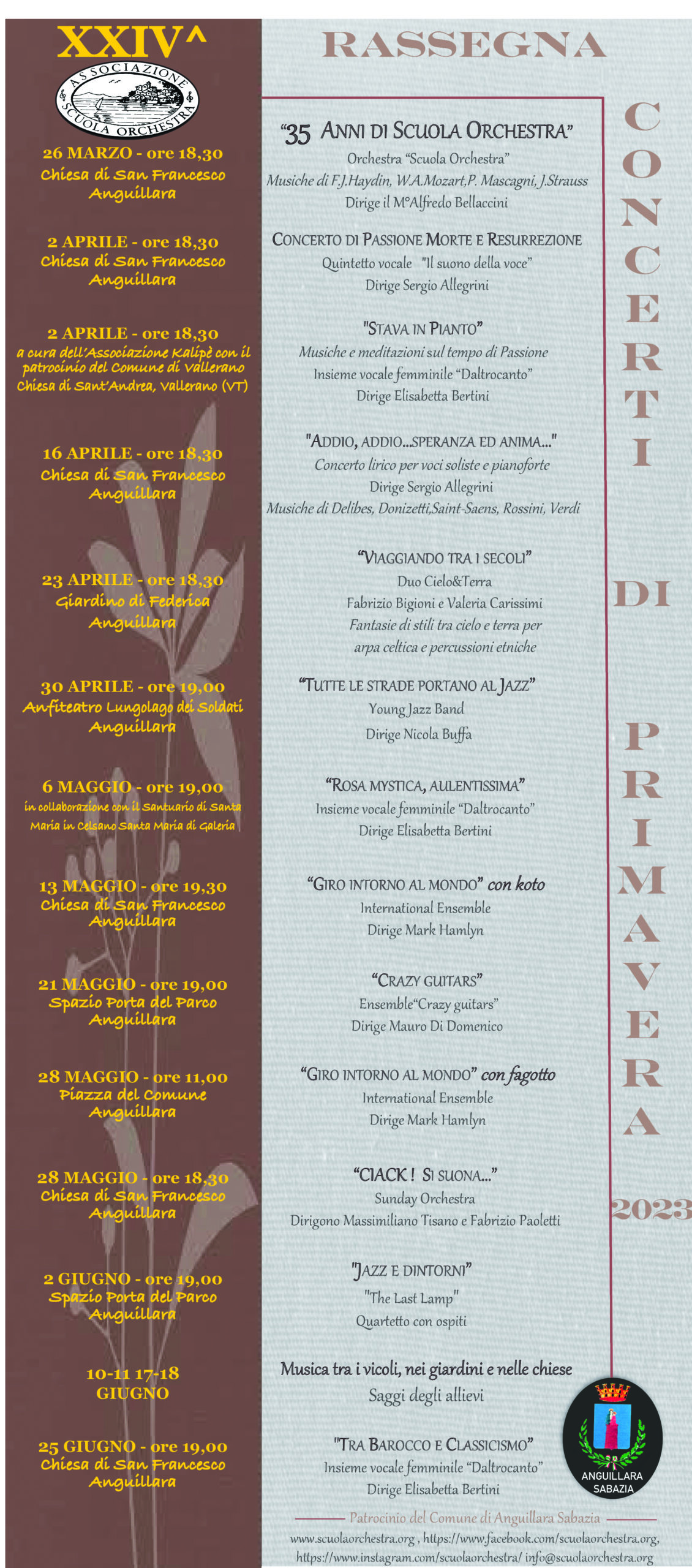 L’Associazione è lieta di invitare la cittadinanza all’apertura della Rassegna dei Concerti di Primavera con il Concerto “35 Anni di Scuola Orchestra” eseguito dall’Orchestra “Scuola Orchestra” e diretto dal M° Alfredo Bellaccini, domenica, 26 marzo 2023 alle ore 18:30 nella Chiesa di San Francesco ad Anguillara