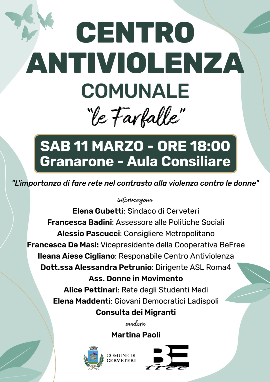 Oltre al Sindaco di Cerveteri Elena Gubetti, interverranno Francesca Badini, Assessore alle Politiche Sociali, Alessio Pascucci, Consigliere della Città Metropolitana di Roma Capitale, Francesca De Masi, Vicepresidente della Cooperativa BeFree, Ileana Aiese Cigliano, Responsabile del Centro Antiviolenza, la Dottoressa Alessandra Petrunio, Dirigente della Asl Roma 4, Alice Pettinari, Rete degli Studenti Medi, Elena Massenti, Giovani Democratici Ladispoli. Interventi anche dell’Associazione Donne in Movimento e della Consulta dei Migranti. Modera l’incontro, Martina Paoli.